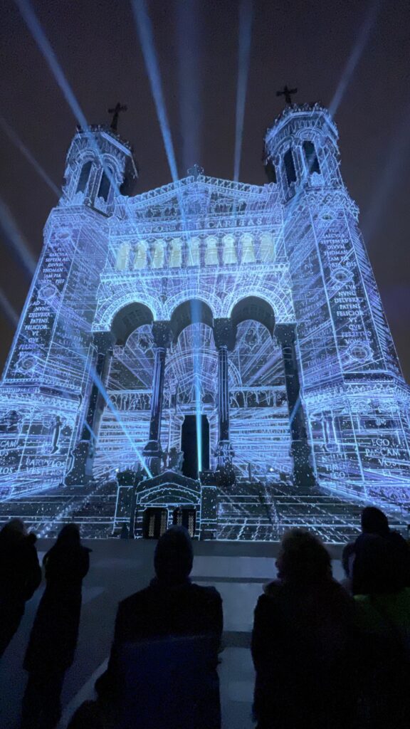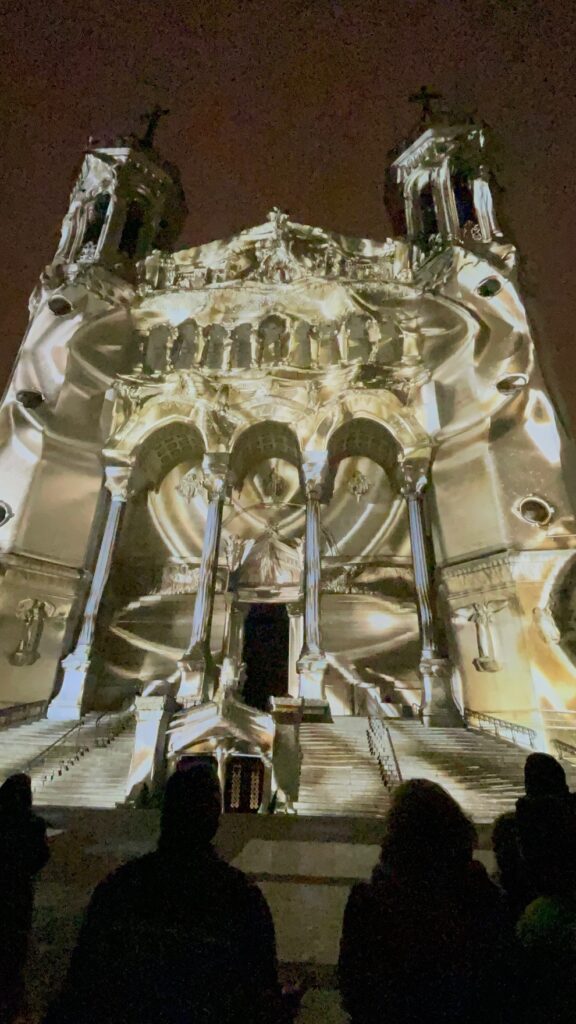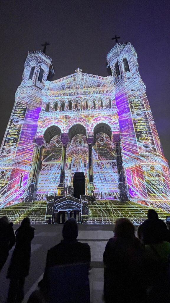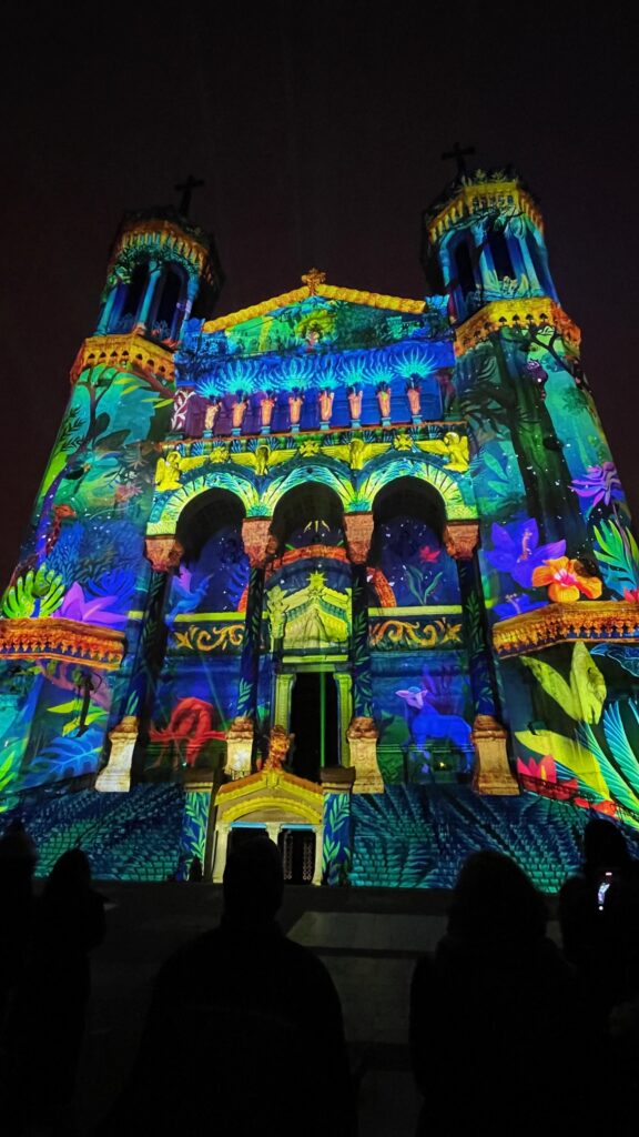 Lors de notre séjour à Lyon, nous avons assisté à Fourvière en Lumière, un spectacle lumineux qui sublime la basilique de Notre Dame de Fourvière. À la tombée de la nuit, projections visuelles, jeux de couleurs et musique enveloppent les façades et les escaliers, créant une ambiance immersive unique sur un monument unique de la région.
