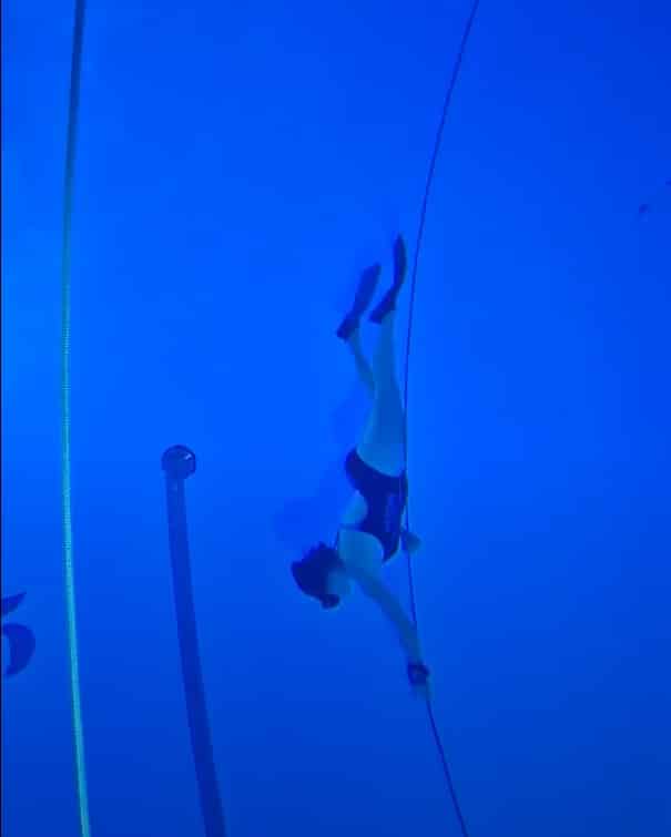 Maintenant, c’est dans le grand bain que ça se passe ! Je distingue sous mes pieds le fond 20 mètres plus bas. L’effet loupe entre l’eau et le masque nous donne cette impression que c’est beaucoup plus près. Détendue, la respiration lente et profonde, j’observe d’abord. Une fois mon tour venu, je ne descends que lorsque je me sens suffisament prête, et cette fois-ci c’est poumons pleins ! Alors si je souhaite éviter de flotter comme un bouchon, je m’aide du bout (prononcez « boute ») et je descends le long de ce long fil à l’aide de mes bras. Des mouvements souples et doux, afin d’éviter d’augmenter le rythme cardiaque (qui incite à être essouflé et donc avoir envie de respirer, je ne vous apprends rien sur le « cardio »).