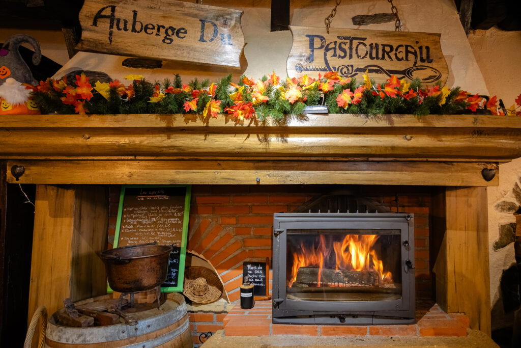 Dès que j’ai franchi la porte, j’ai été conquise par l’atmosphère du lieu : un décor rustique, des grandes tables en bois, et surtout le feu de cheminée qui crépitait doucement, diffusant une chaleur bienfaisante après la matinée fraîche. L’ambiance était familiale et conviviale, avec ce petit supplément d’âme propre aux auberges de campagne où l’on se sent immédiatement à l’aise — presque comme à la maison.