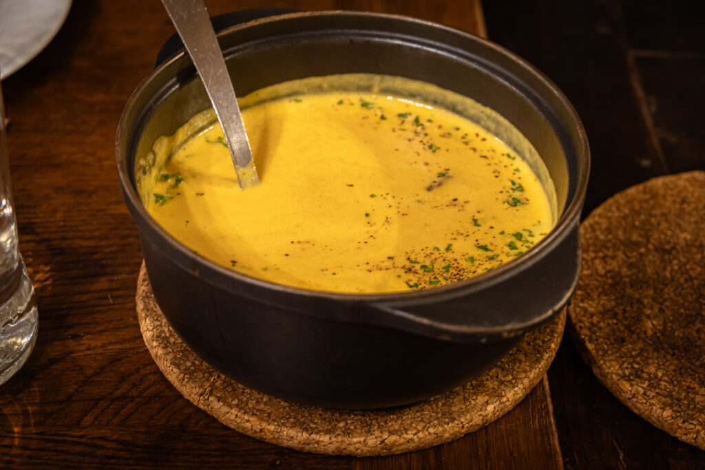 Dès la première cuillère, la Crème de potimarron aux cèpes a littéralement conquis mon cœur. Le mariage subtil du potimarron doux et des arômes boisés des cèpes créait une harmonie parfaite : un vrai moment de plaisir gastronomique, réconfortant et délicat à la fois. L’épaule de cochon, fondante et caramélisée au miel, était tout simplement exquise, et la tartelette à la praline apportait cette touche sucrée typiquement lyonnaise que j’adore.