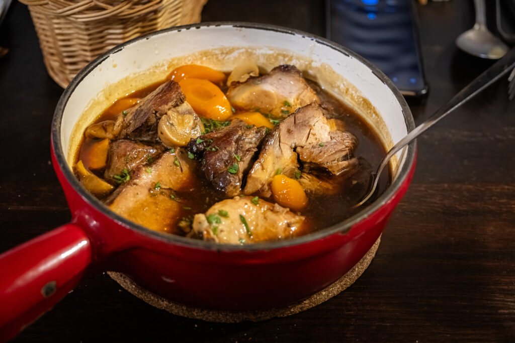Et puis vient le moment tant attendu : celui d’ôter les tabliers, de s’asseoir autour de la grande table et de déguster le fruit de notre travail. Sébastien, en vrai professionnel, a dressé chaque assiette avec soin. Nous avons levé nos verres à cette belle aventure et savouré un repas aussi original que délicieux.
