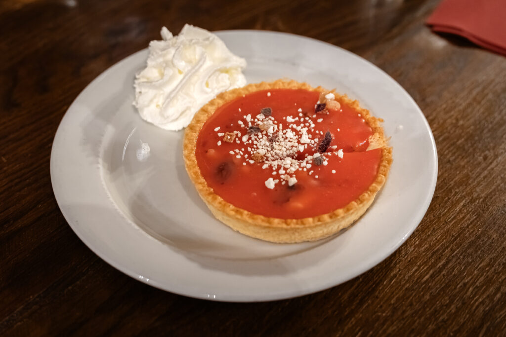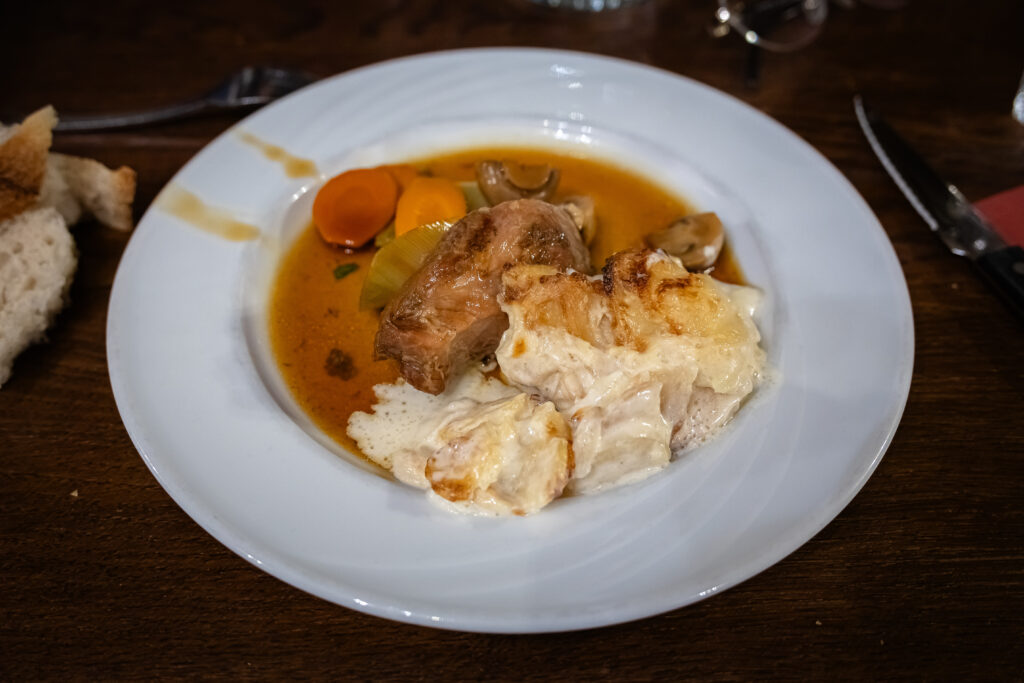 Le menu du jour, à 35 €, offrait un très beau choix d’entrées, plats, fromages et desserts. Pour ma part, j’ai craqué pour une Crème de potimarron aux cèpes en entrée, suivie d’une Épaule de cochon de 7 h au miel, et pour finir, une tartelette à la praline rose.
