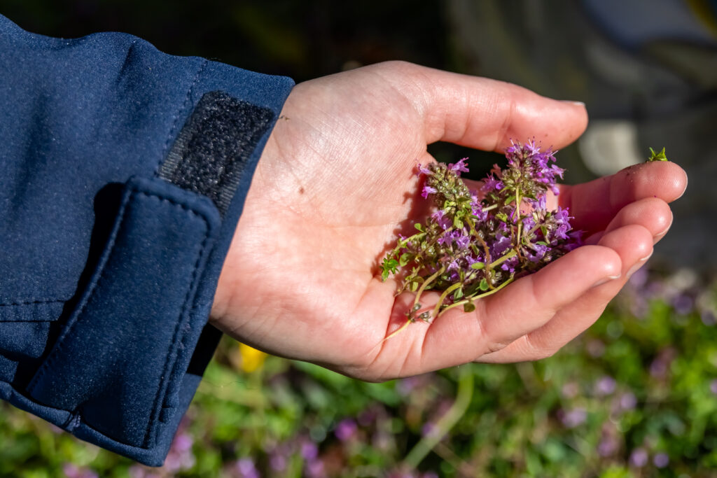 Sous la guidance de Sébastien, nous sommes ensuite partis dans le jardin et les alentours pour reconnaître, toucher, sentir et cueillir les herbes sauvages qui allaient composer notre repas. Quelle surprise de découvrir à quel point la nature regorge de plantes comestibles ! Oseille, serpolet, amarante, carottes sauvages, prunelles… Autant de saveurs que l’on croise souvent sans même les remarquer.