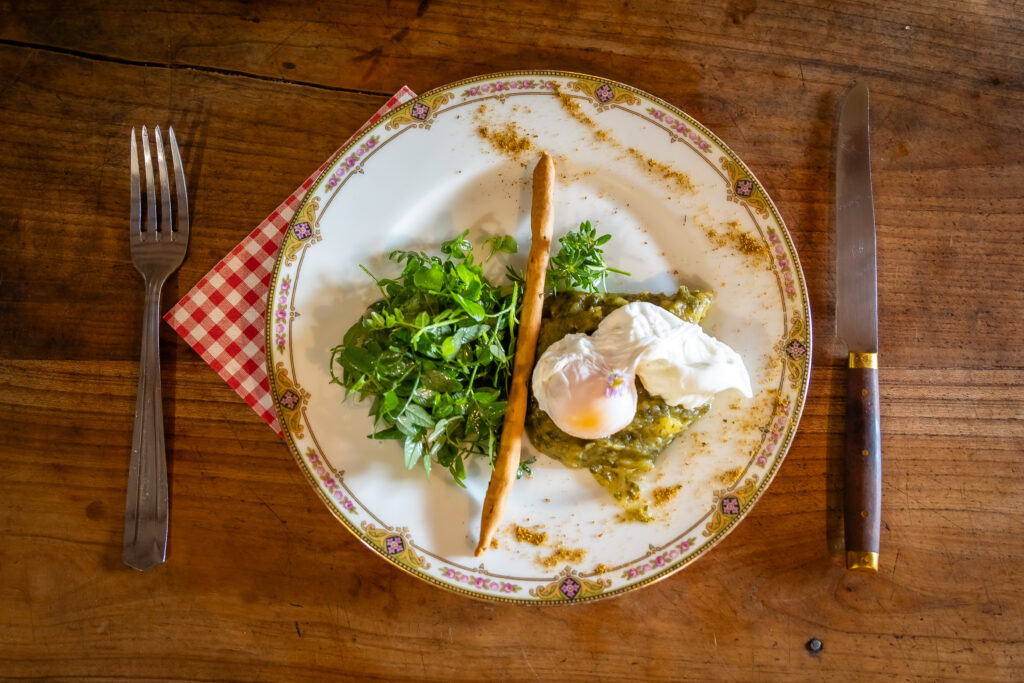 Entrée : Compotée de pommes à l’oseille, œuf poché & gressin au serpolet