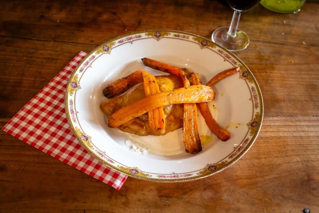 Plat : Petit pâté d’amarante, crème aux carottes sauvages & carottes rôties