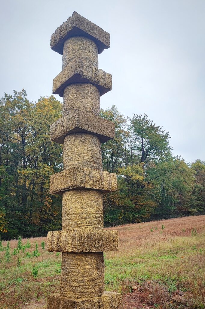 Au détour d’un champ, une forme dorée s’élève : La Colonne Dorée. À première vue, on croirait voir des bottes de paille empilées, mais en s’approchant, on découvre une sculpture monumentale réalisée en moulages de résine et de pierre. Elle marque l’orée de la forêt comme une borne, un symbole du lien entre nature et travail agricole.