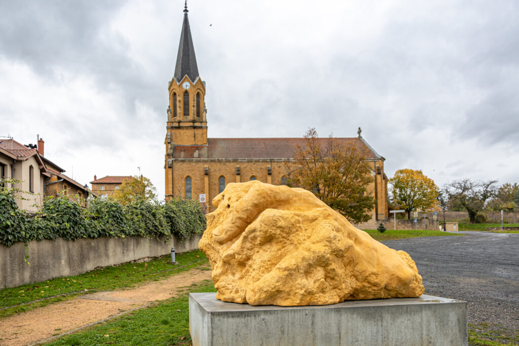 La première œuvre, intitulée Mémoire Fossile, m’a immédiatement fascinée. Une main humaine monumentale semble jaillir de la pierre, la serrant fermement… ou peut-être est-ce la pierre qui prend forme humaine ? Dans cette fusion troublante du corps et du minéral, on sent tout le poids du temps. Ce qui m’a particulièrement émue, c’est l’harmonie entre la sculpture et l’église voisine, bâtie dans la même pierre dorée : un dialogue silencieux entre passé et présent, entre foi et matière.