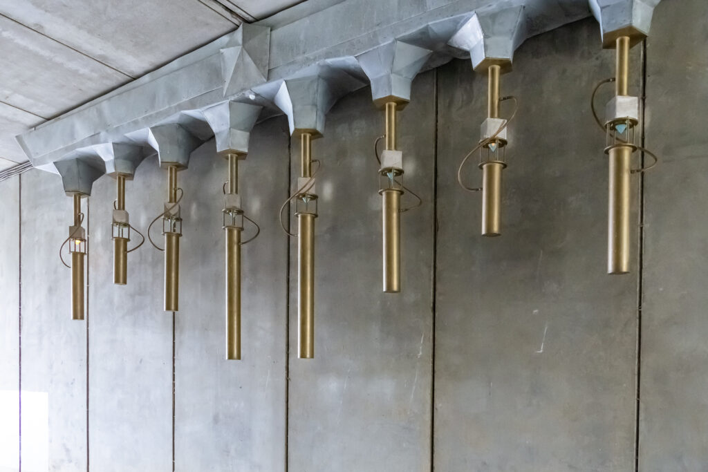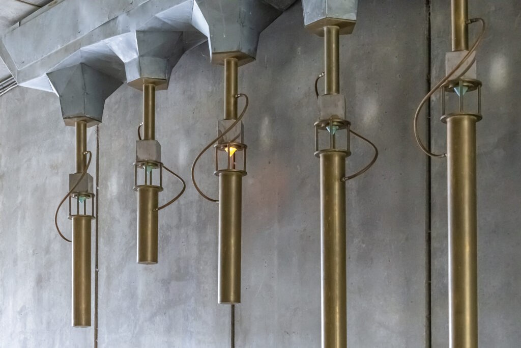Quelques kilomètres plus loin, sous un pont de l’autoroute A89, nous avons découvert ORG MITRA, une œuvre sonore qui transforme le vacarme de la route en une musique presque céleste. Suspendues comme des stalactites, des structures métalliques recueillent les vibrations du trafic pour les faire résonner dans le tunnel.
