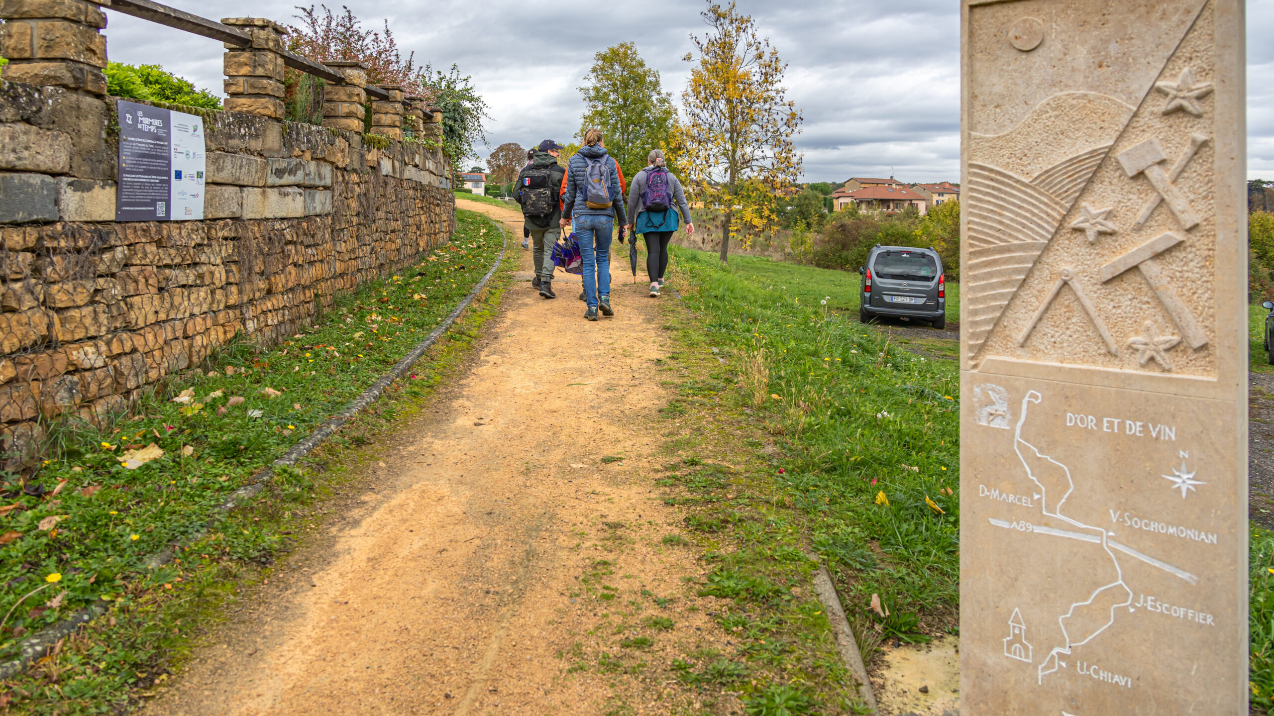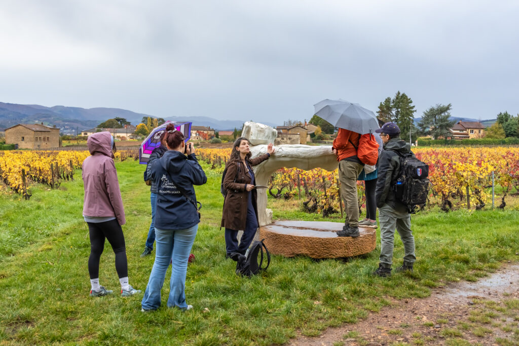 Après ce déjeuner gourmand à Courzieu, nous étions prêtes à reprendre la route — le ventre comblé, l’esprit curieux et les chaussures de marche bien lacées. Sous une pluie fine et en compagnie de Camille, notre guide passionnée, nous avons entamé le circuit d’Or et de Vin, l’un des trois parcours du projet Les Murmhttps://lesmurmuresdutemps.fr/ures du Temps, à Saint-Germain-Nuelles.
