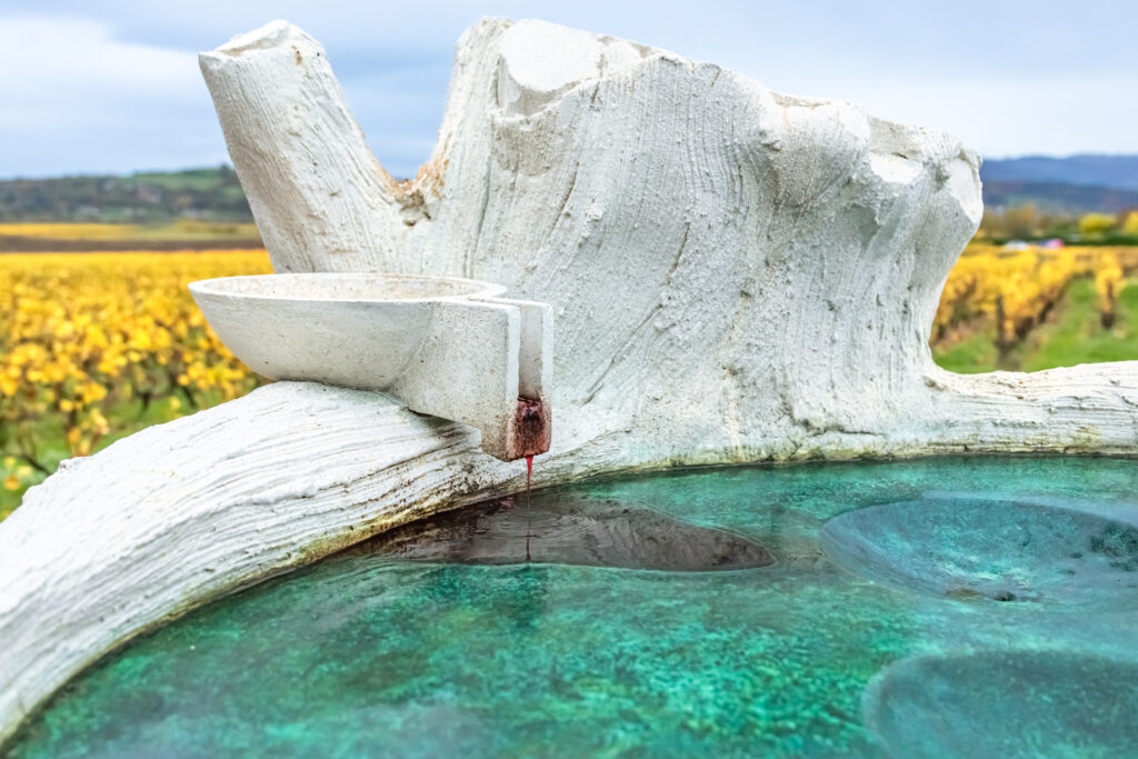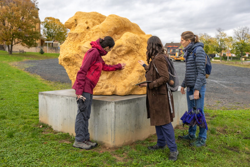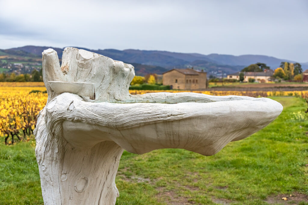 Notre parcours s’est terminé par une œuvre empreinte de philosophie et de douceur : Géo-Empathie. Ici, l’art rencontre la science pour rendre hommage au travail de la vigne. Une partie cuivrée recueille l’eau de pluie et le vin, qui, en s’oxydant, colorent peu à peu la pierre et la transforment.