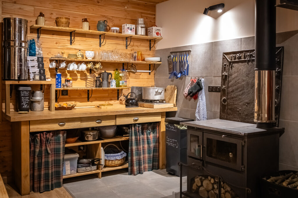 À notre arrivée : cadenas à code pour accéder au terrain, puis une boite à clés pour accéder à la maison. L’instant d’entrée marque bien la transition : on laisse derrière nous le monde extérieur, on entre dans un lieu hors du temps. À l’intérieur, une ambiance rustique & chaleureuse, des matériaux naturels, un grand poêle à bois pour réchauffer les corps et les esprits.
