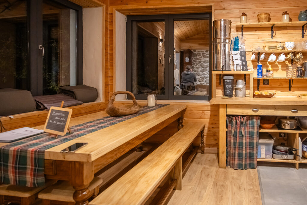 Après notre journée active, vient le moment de se poser, déconnecter et s’imprégner de la nature. Pour cela, nous avions prévu une nuit au Refuge d’Yzeron, mais pas n’importe quel gîte : un véritable gîte autonome en eau et en électricité, niché au cœur de la forêt.