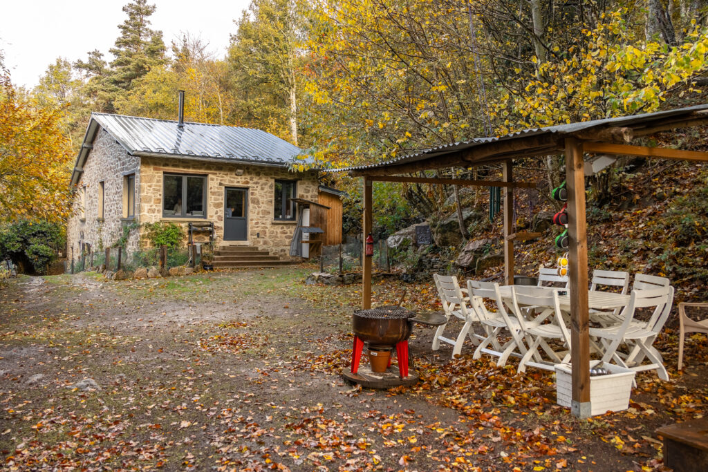 Le lendemain matin, j’ai ouvert les yeux avec l’impatience de découvrir où j’étais vraiment. La lumière d’automne filtrait entre les arbres, les feuilles prenaient des teintes chaudes, et le gîte — extérieur — s’avérait encore plus charmant à la lumière du jour. Situé à 800 m d’altitude dans la forêt d’Yzeron, il offre un cadre de déconnexion totale.