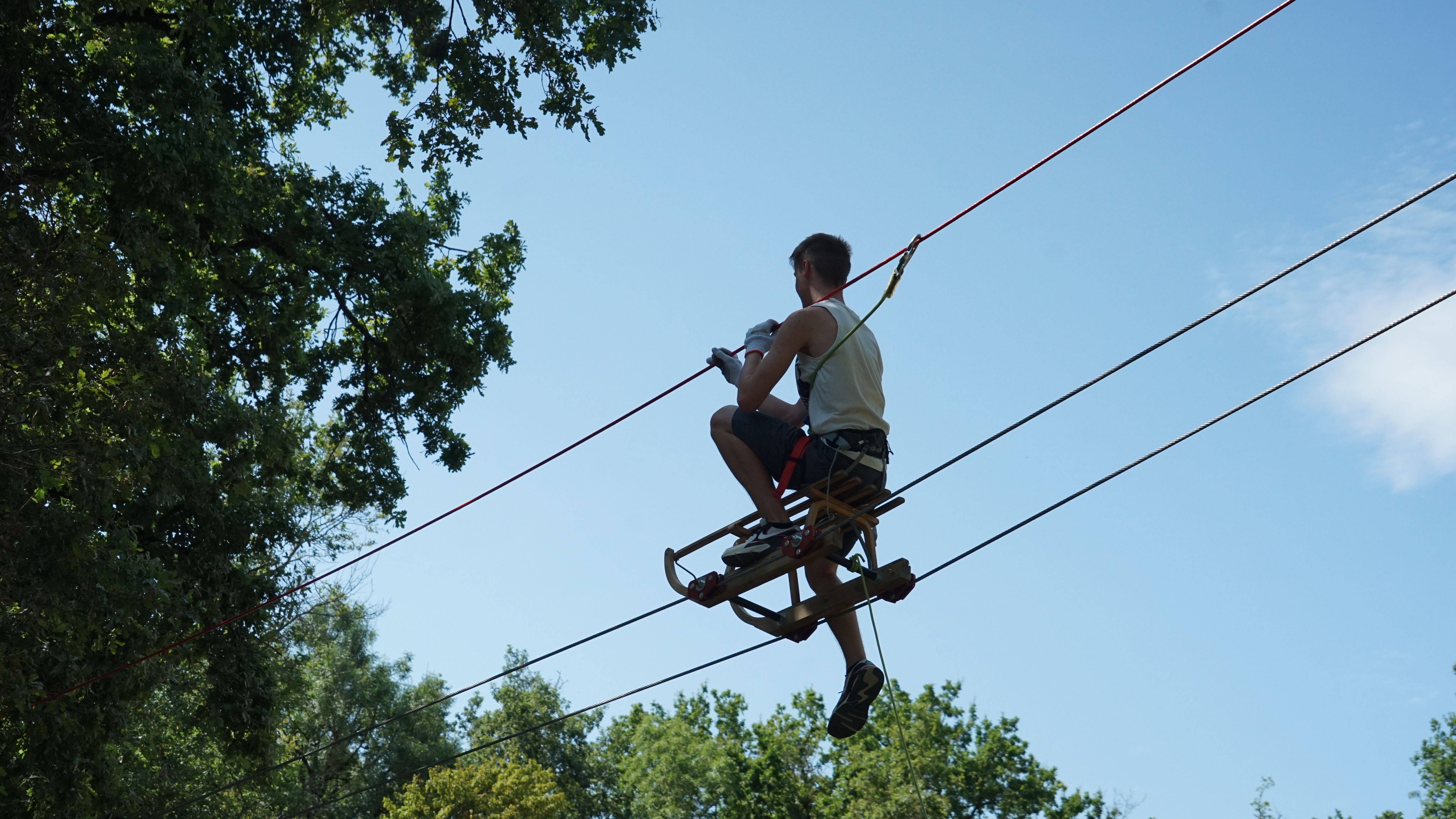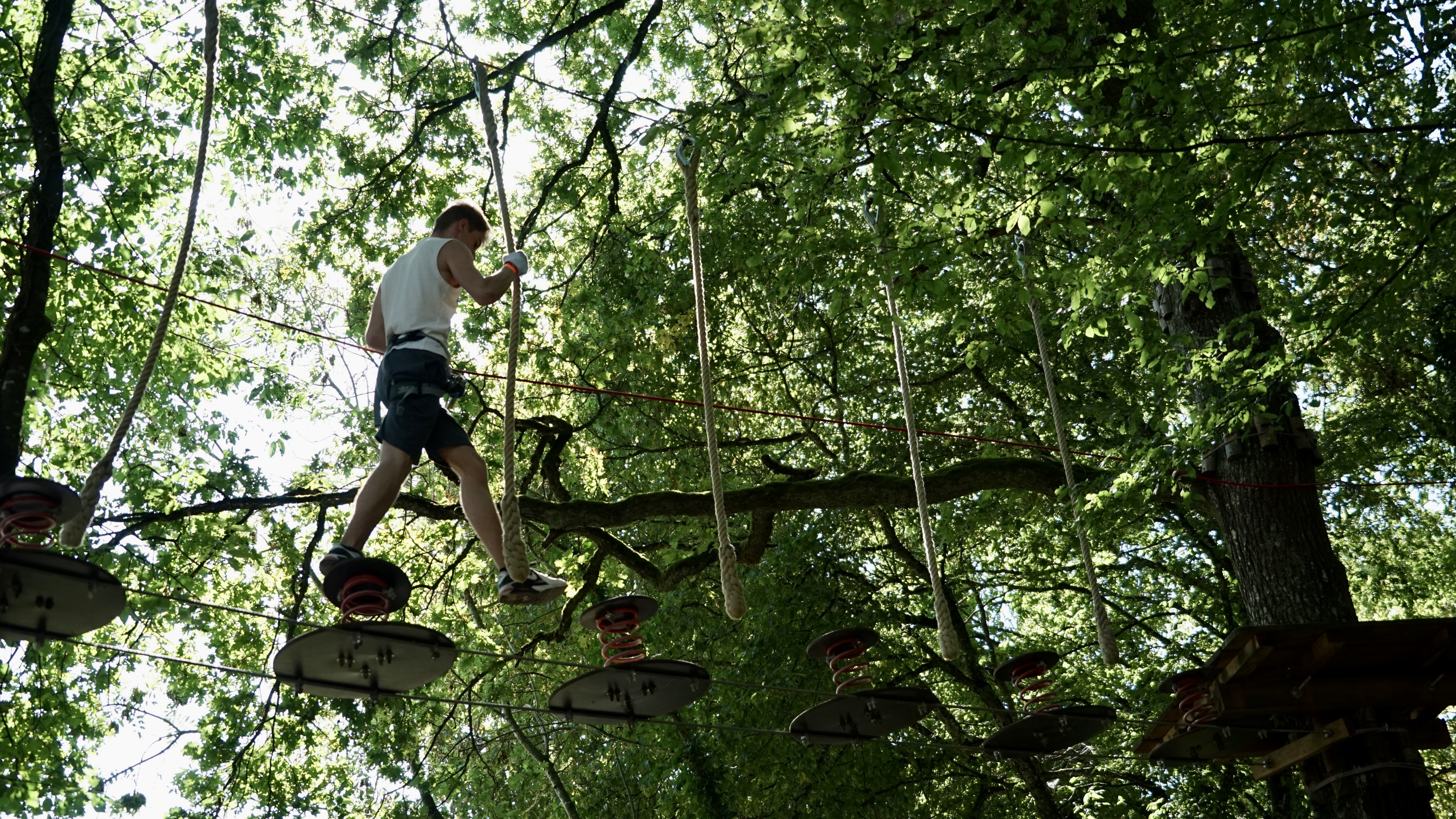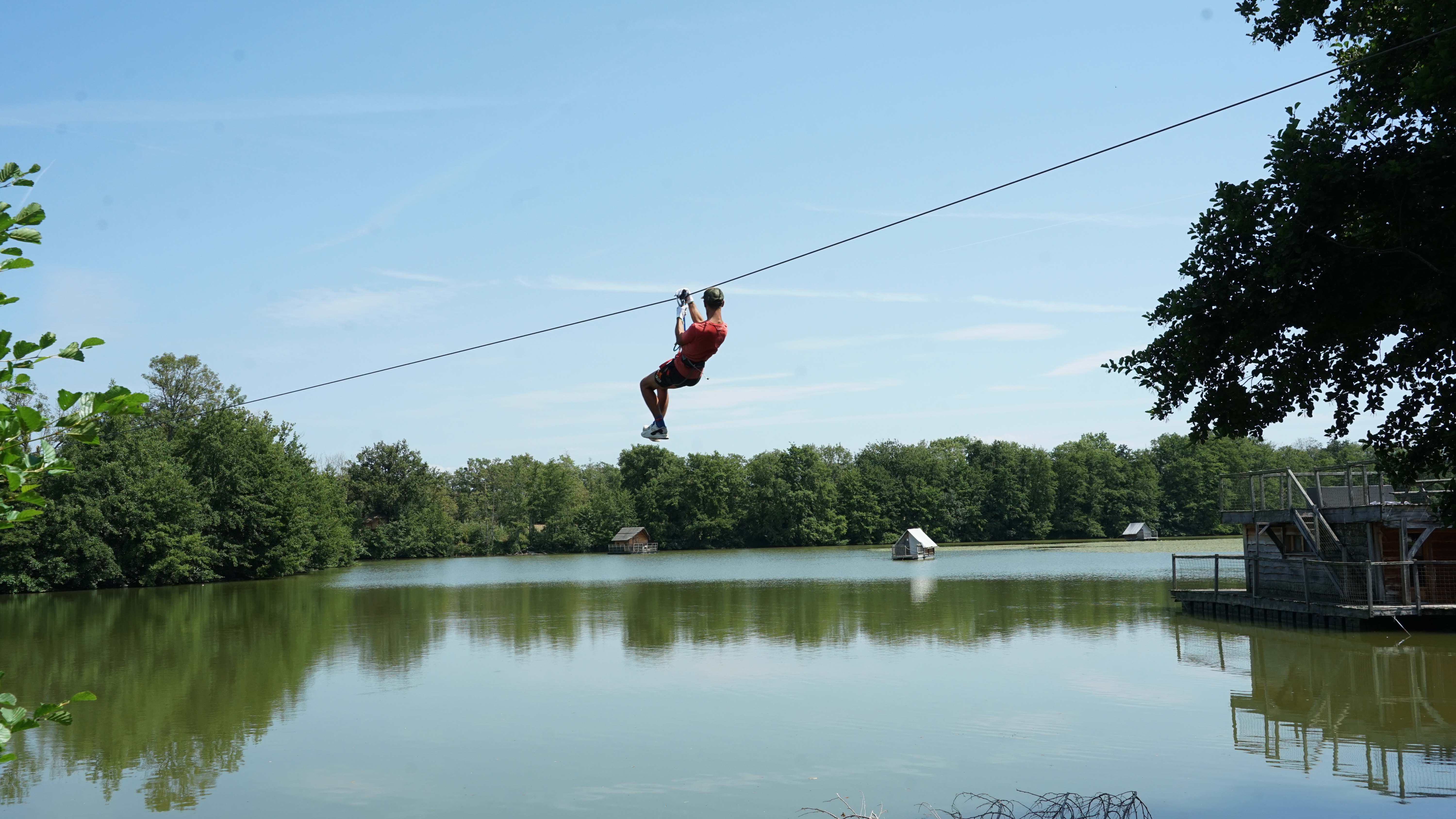 Tyrolienne géante traversant l'étang.
