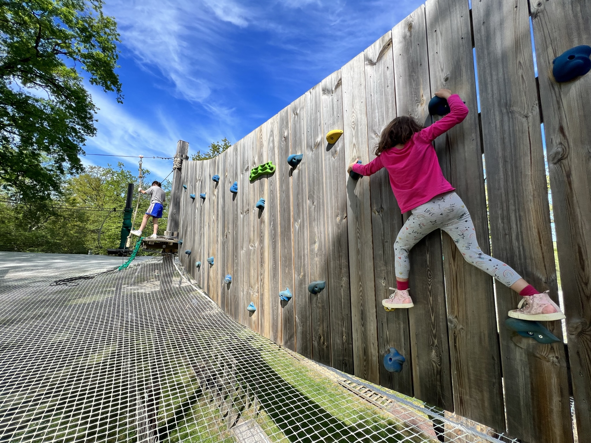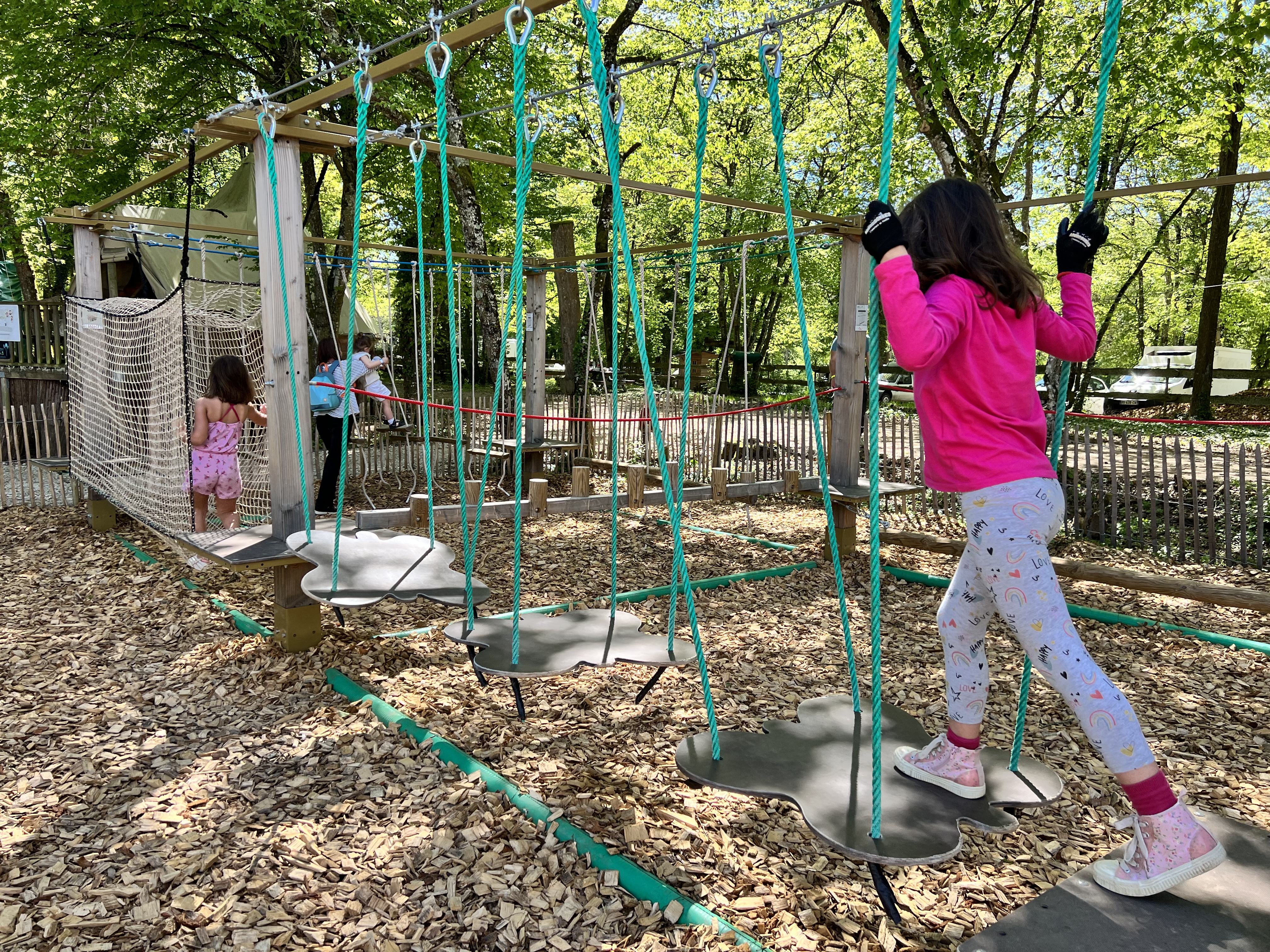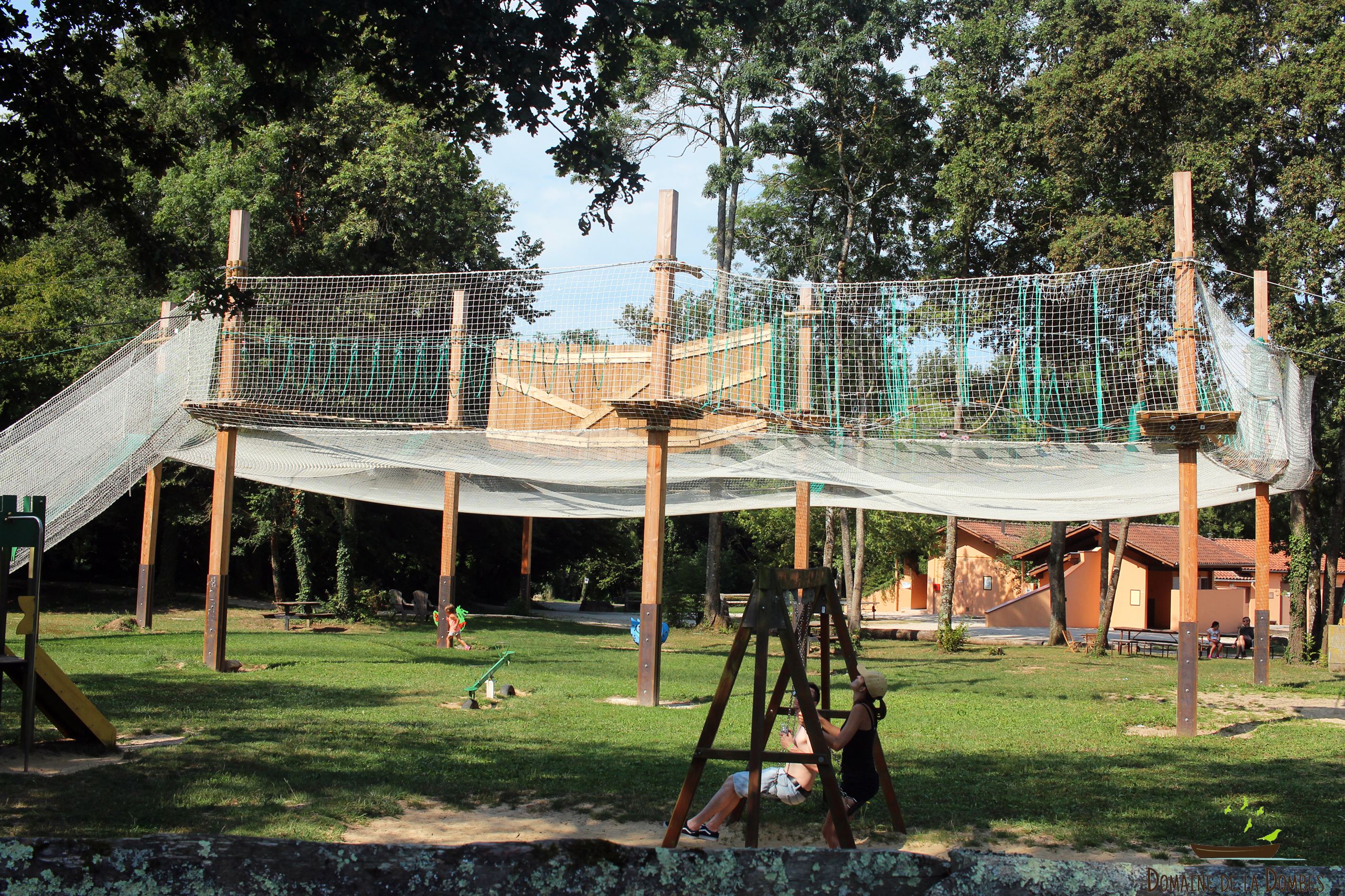 Différents parcours accrobranche pour enfants au Domaine de la Dombes. Les parcours sont sécurisés en ligne de vie continue, accessibles dès 2 ans.
