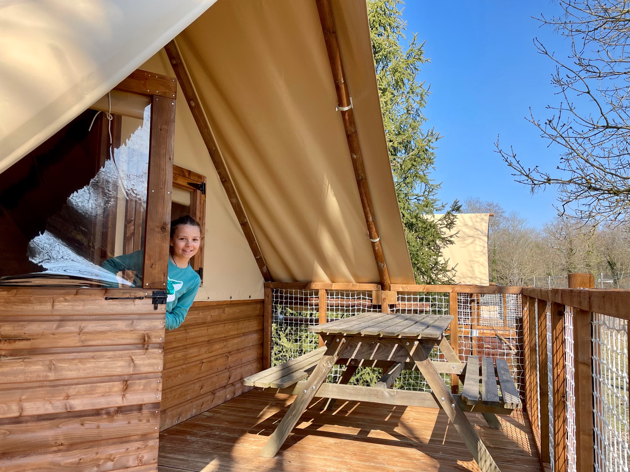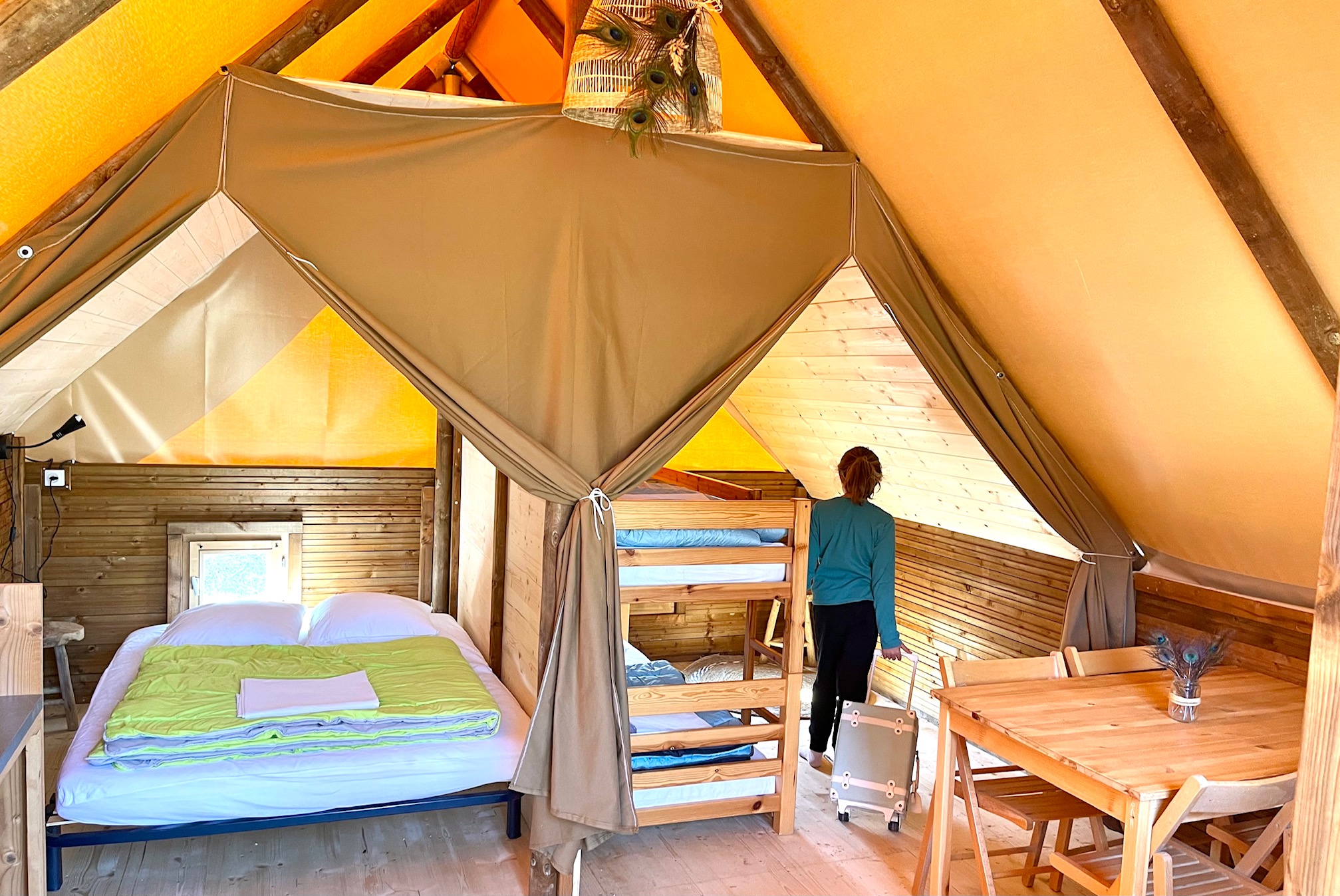 D’une superficie de 20m² : mi cabane, mi tente surélevée sur pilotis, avec terrasse surplombant le parc animalier des Cervidés pour dormir au milieu des animaux.