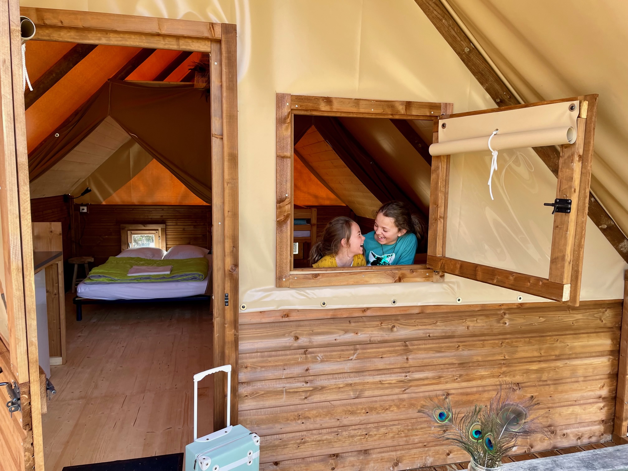 Lodge en gamme confort (avec électricité) et toilettes sèches, il peut accueillir jusqu’à 4 personnes, et se compose de 2 chambres (une avec un lit double, l’autre avec 2 lits superposés), une pièce centrale avec table, chaises, kitchenette avec frigo, cafetière et plaques de cuisson ainsi que de la vaisselle.