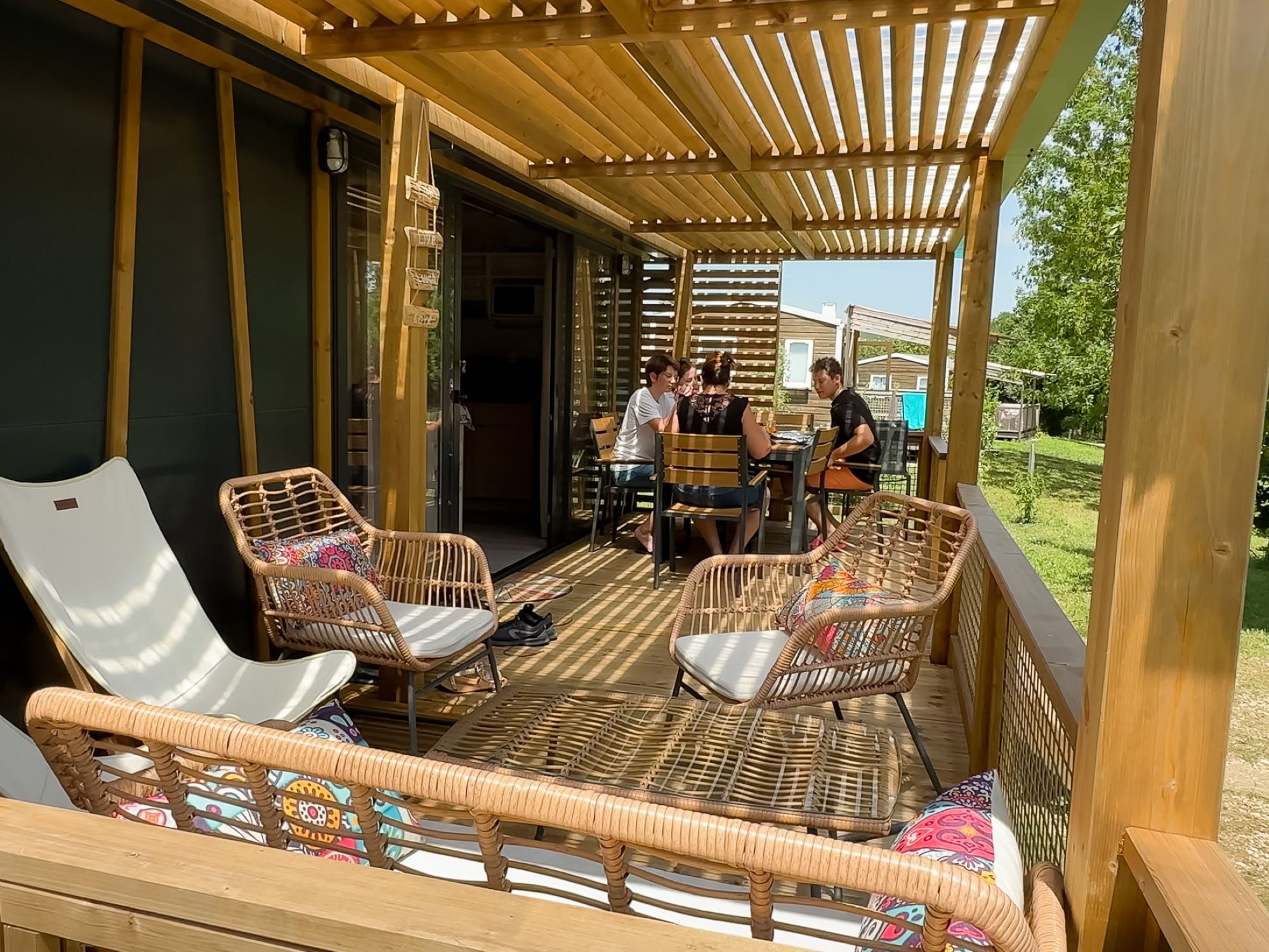 Grand chalet moderne dédié à la famille dans notre camping en Trièves : spacieux, zen, accueillant, et pratique.