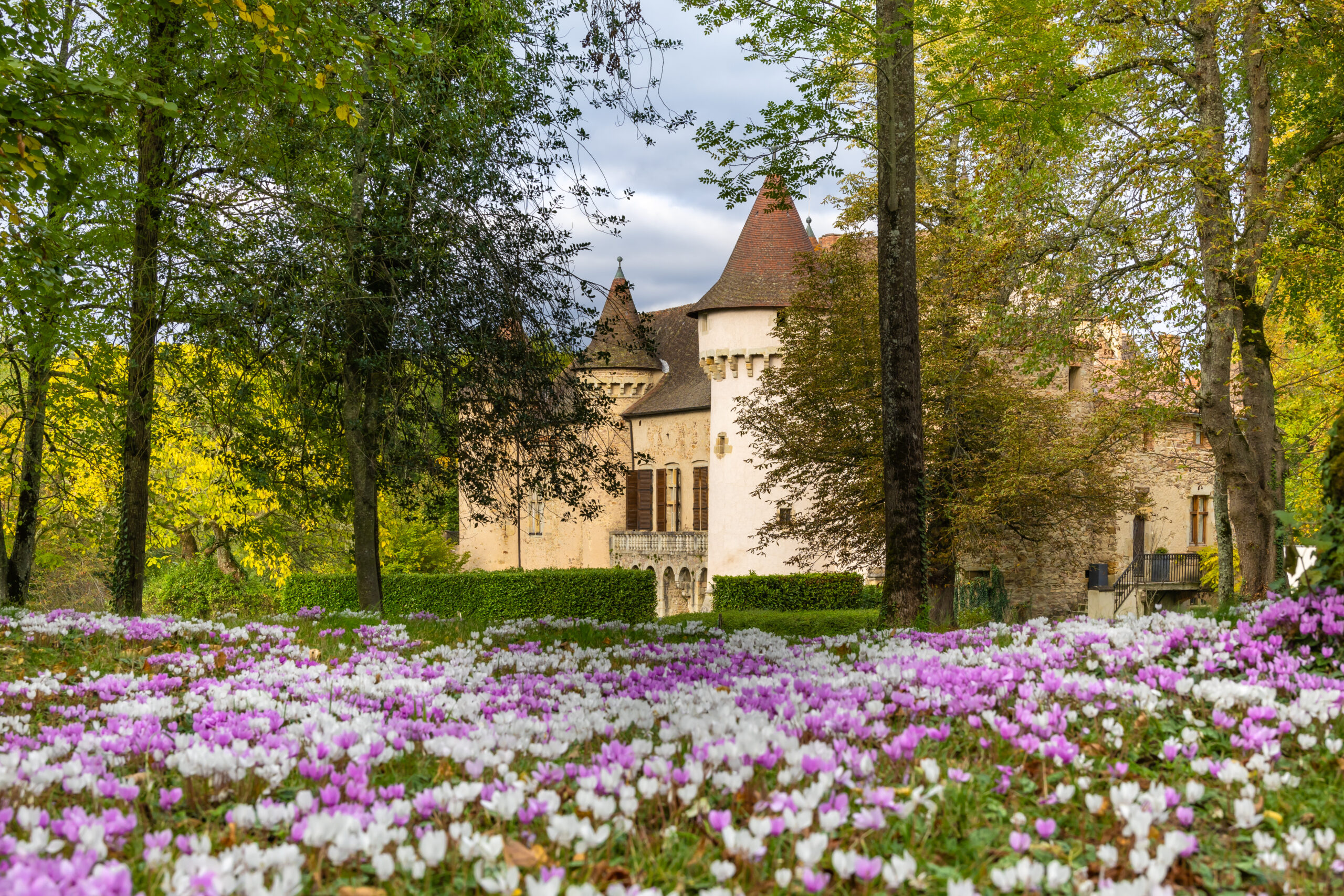 L'automne au Château d'Aulteribe offre un spectacle absolument enchanteur ! C'est la saison où les cyclamens sauvages entrent en floraison dans le parc, créant un véritable tapis fleuri d'une délicatesse inouïe au pied du château. Ces milliers de petites fleurs roses, mauves et blanches tapissent le sol de la forêt, formant une mer de pétales qui ondule doucement sous les arbres. Le contraste entre la majesté de l'architecture du château et cette profusion de cyclamens aux teintes pastel est tout simplement magique. On se croirait dans un conte de fées ! Cette floraison automnale transforme la promenade dans le parc en une expérience féérique et romantique. C'est un moment privilégié de l'année pour visiter ce lieu, quand la nature offre ce cadeau éphémère d'une beauté rare. Un spectacle à ne manquer sous aucun prétexte pour tous les amoureux de la nature et des beaux paysages !