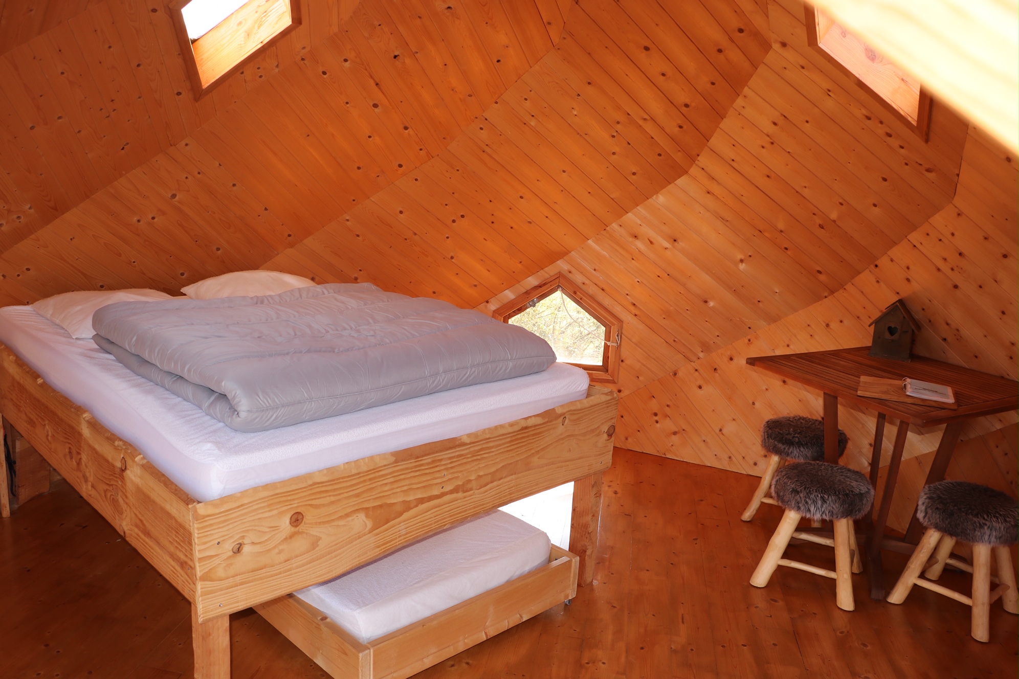 Cette cabane, gamme confort, est situé au dessus du parc des daims, cerfs et des biches.