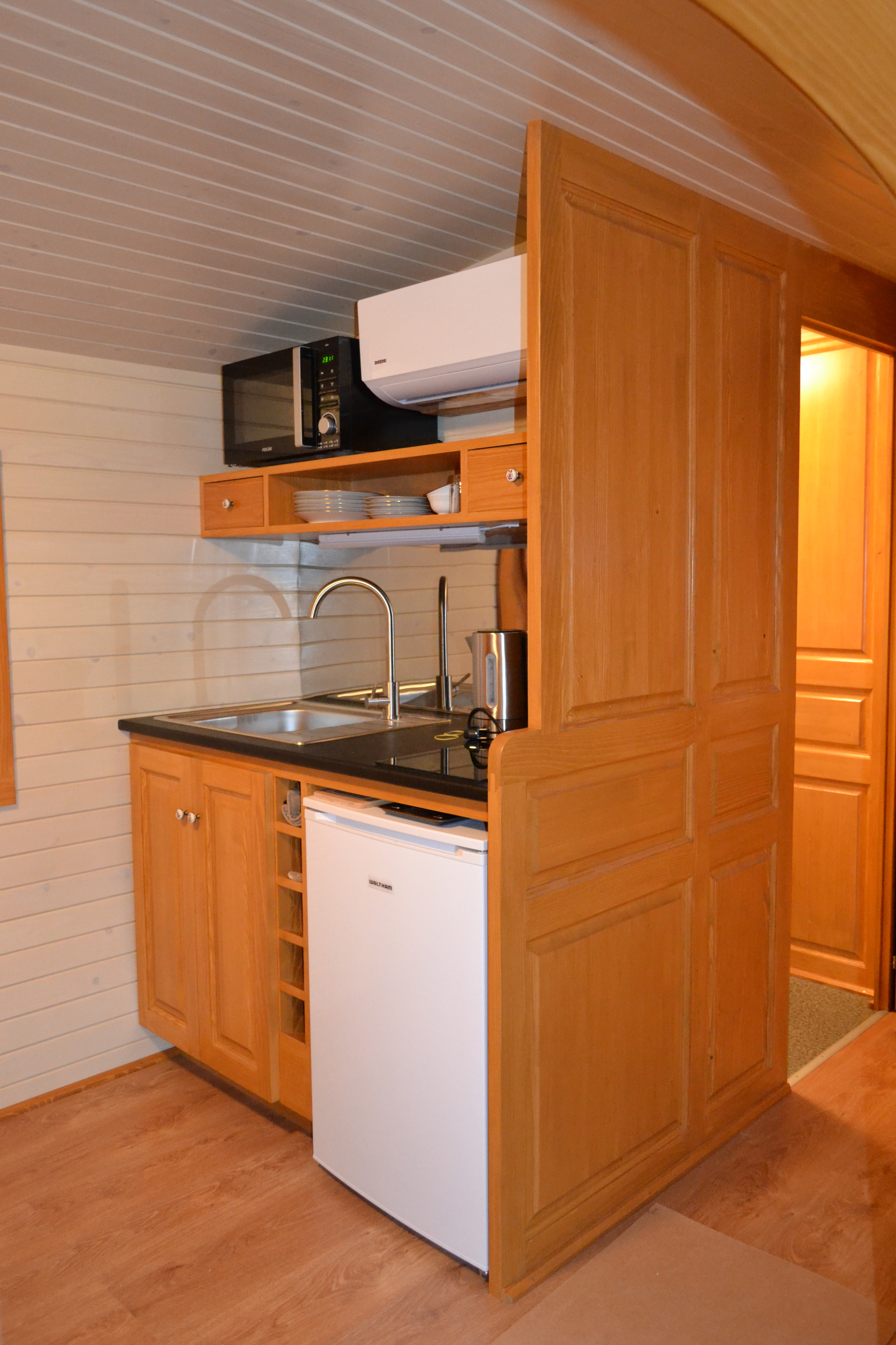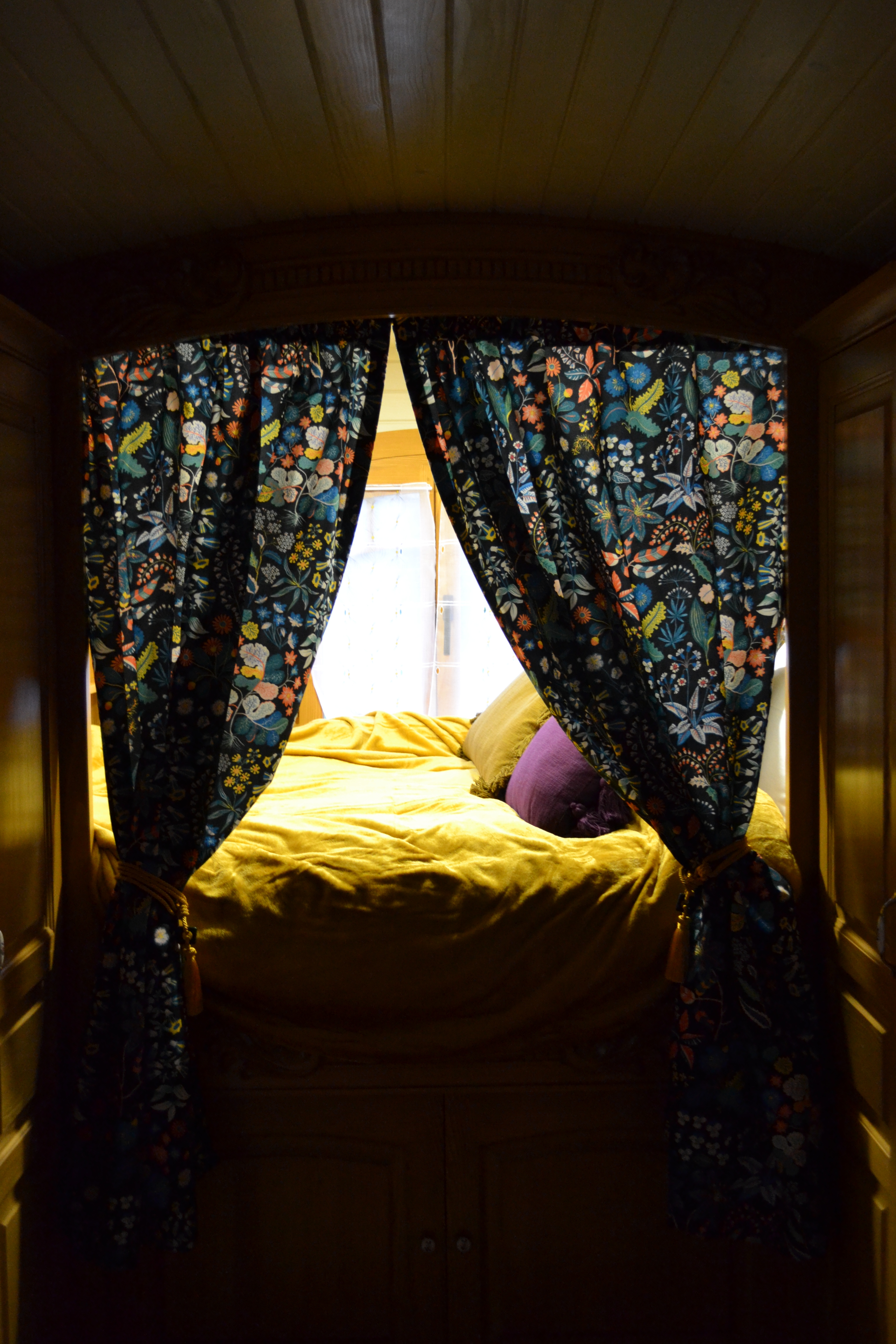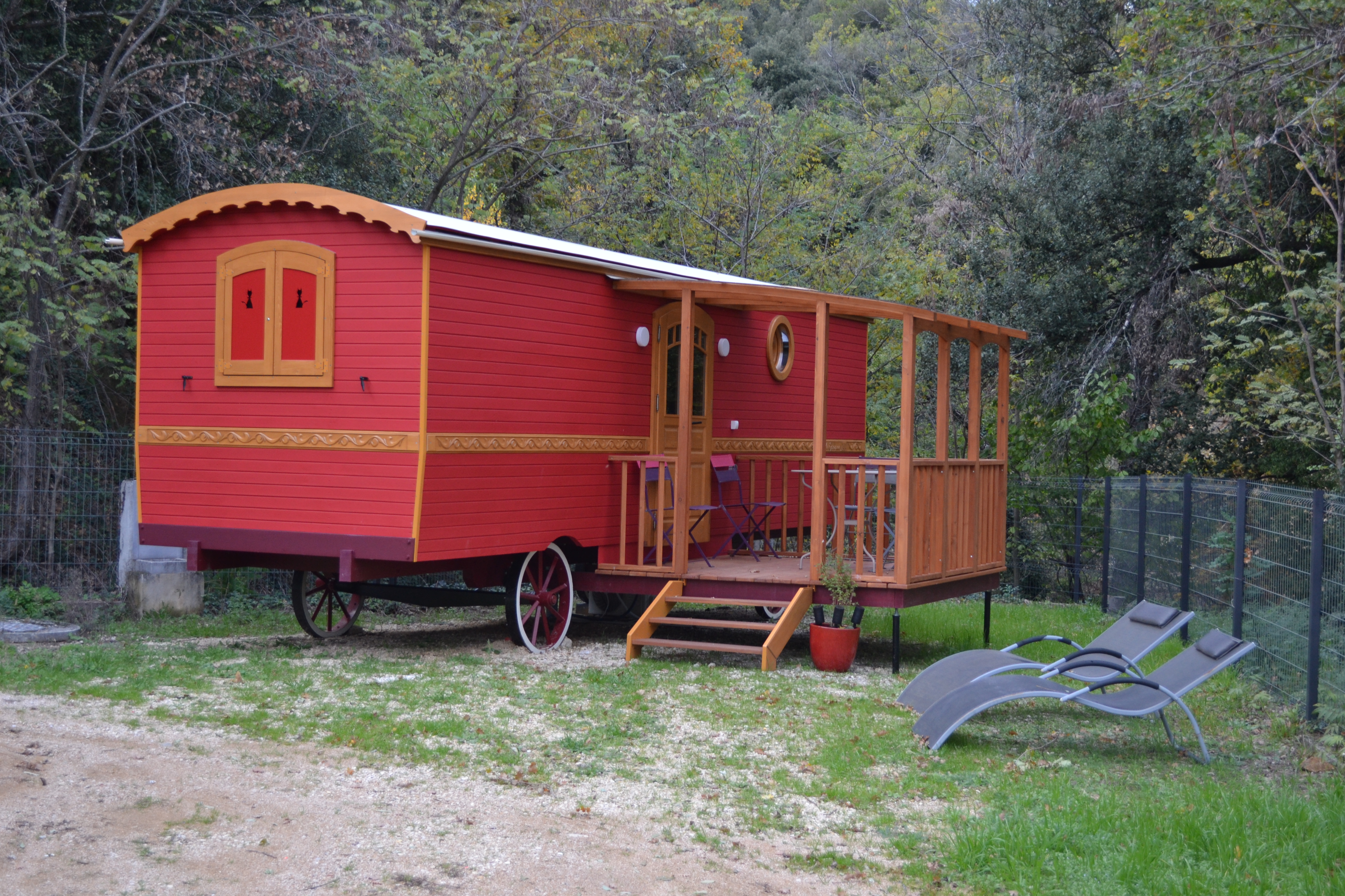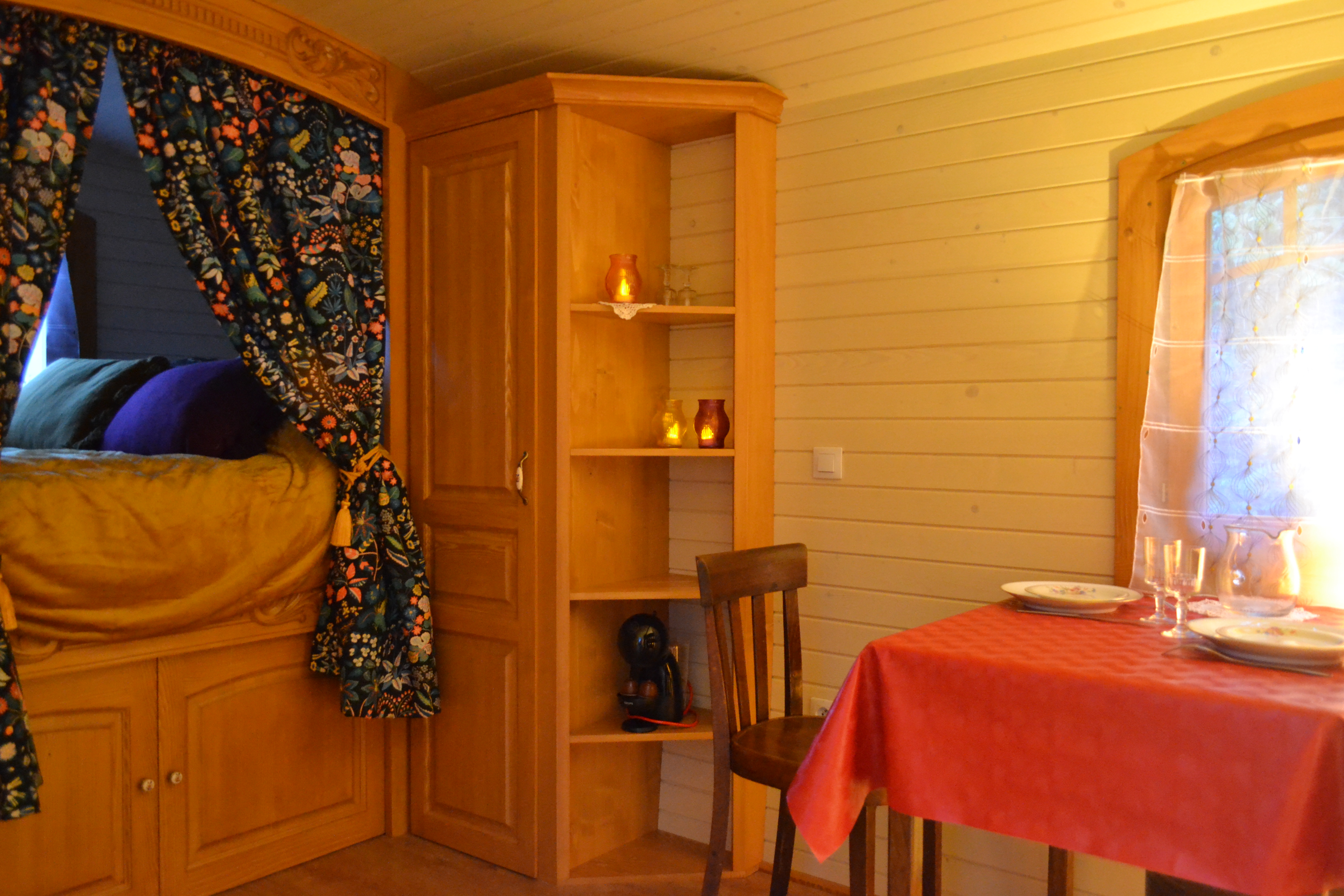 Aux couleurs chaleureuses, la roulotte est composée de deux pièces donnant sur une terrasse privative.