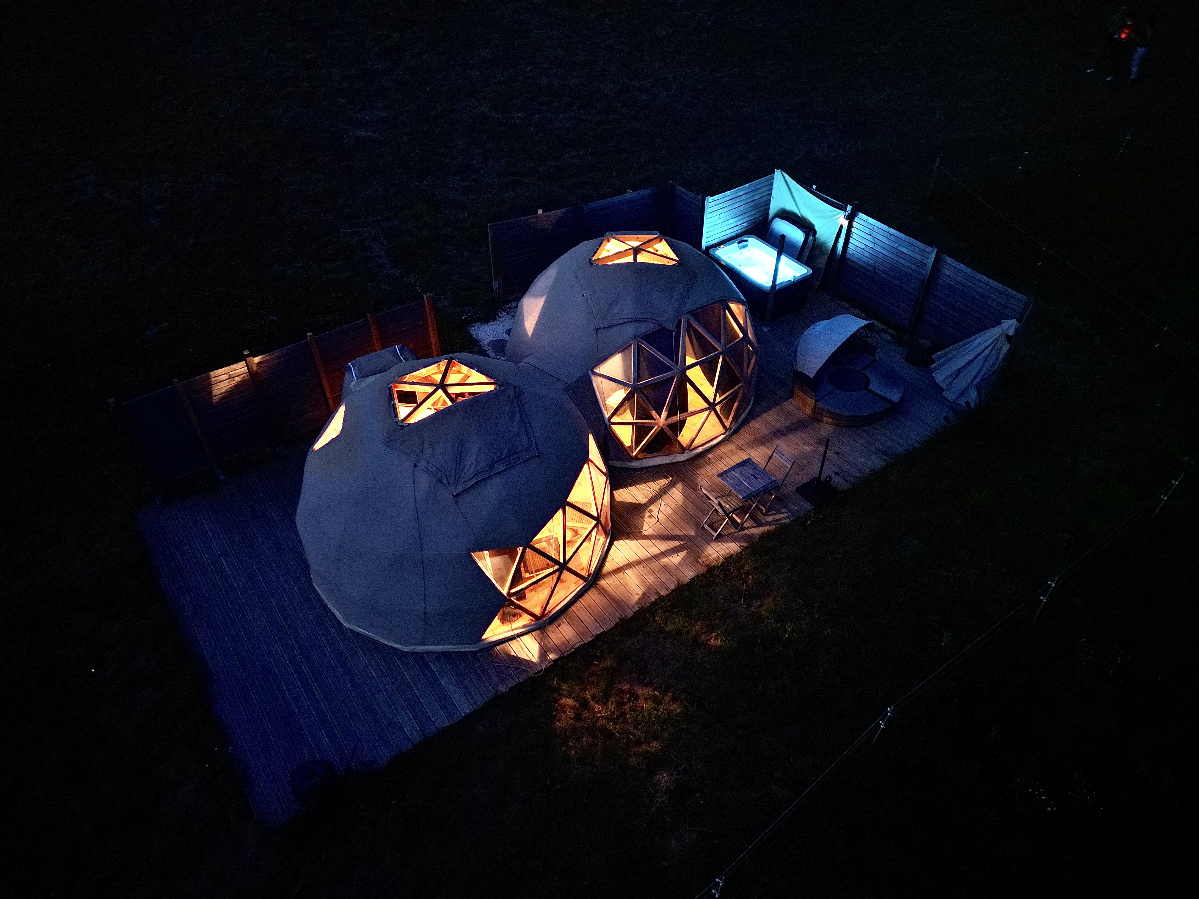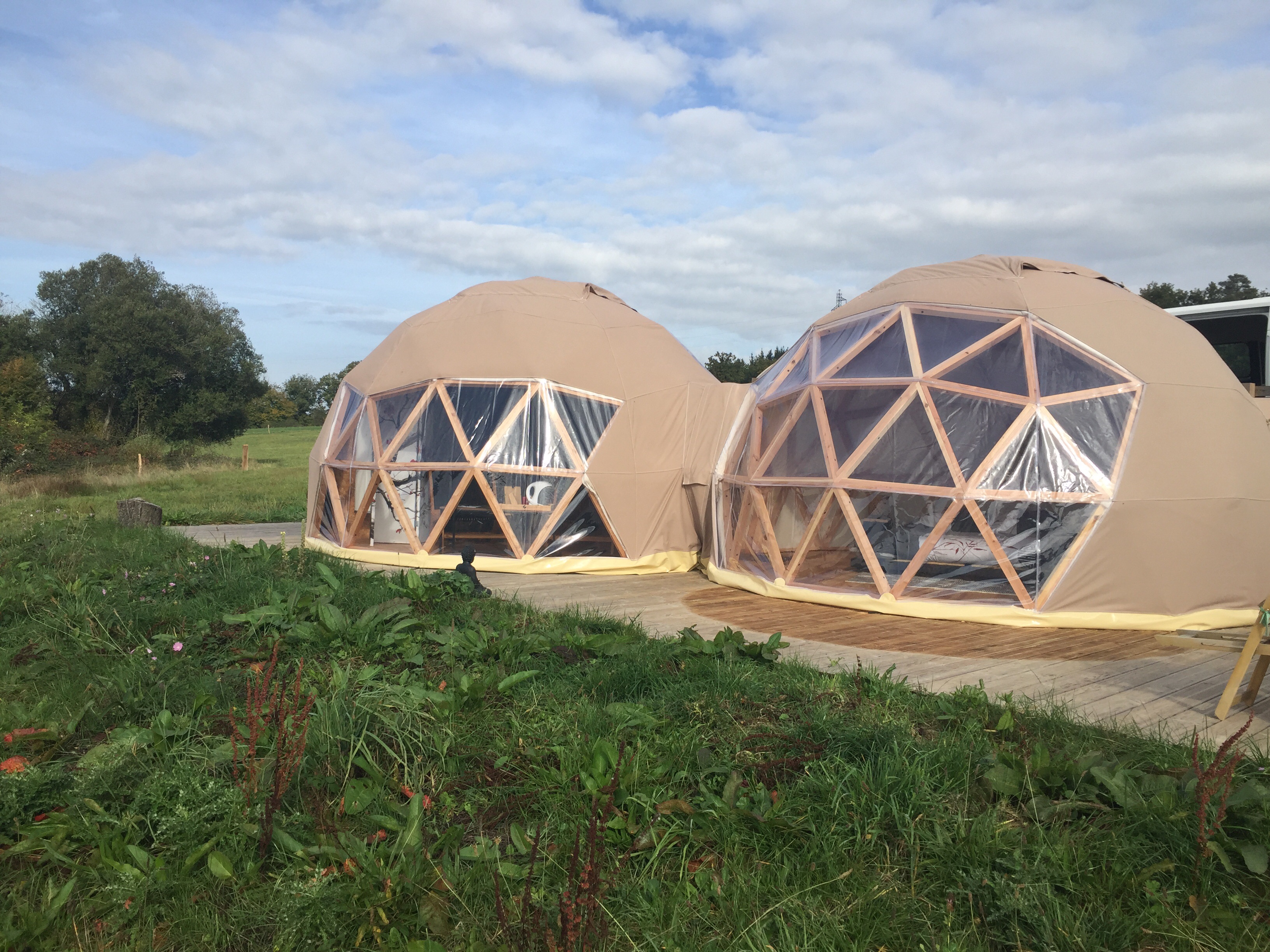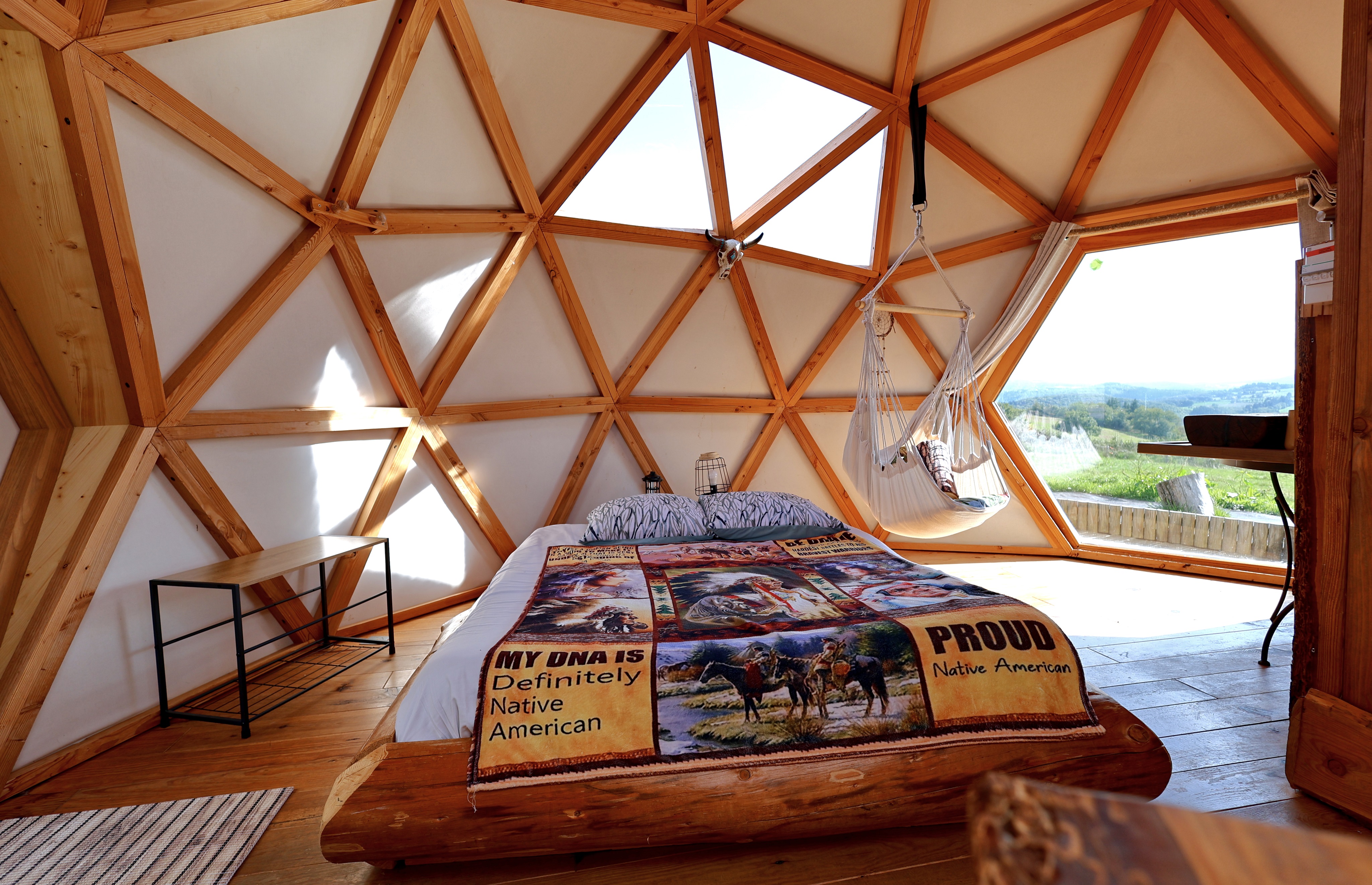 Hébergements insolites dans des dômes en bois et un zôme, décorés différemment et équipés de salle d'eau/ WC, ainsi que de spas privatifs. Structures isolées et chauffées. Différentes formules repas pour le soir. Petit-déjeuner inclus.