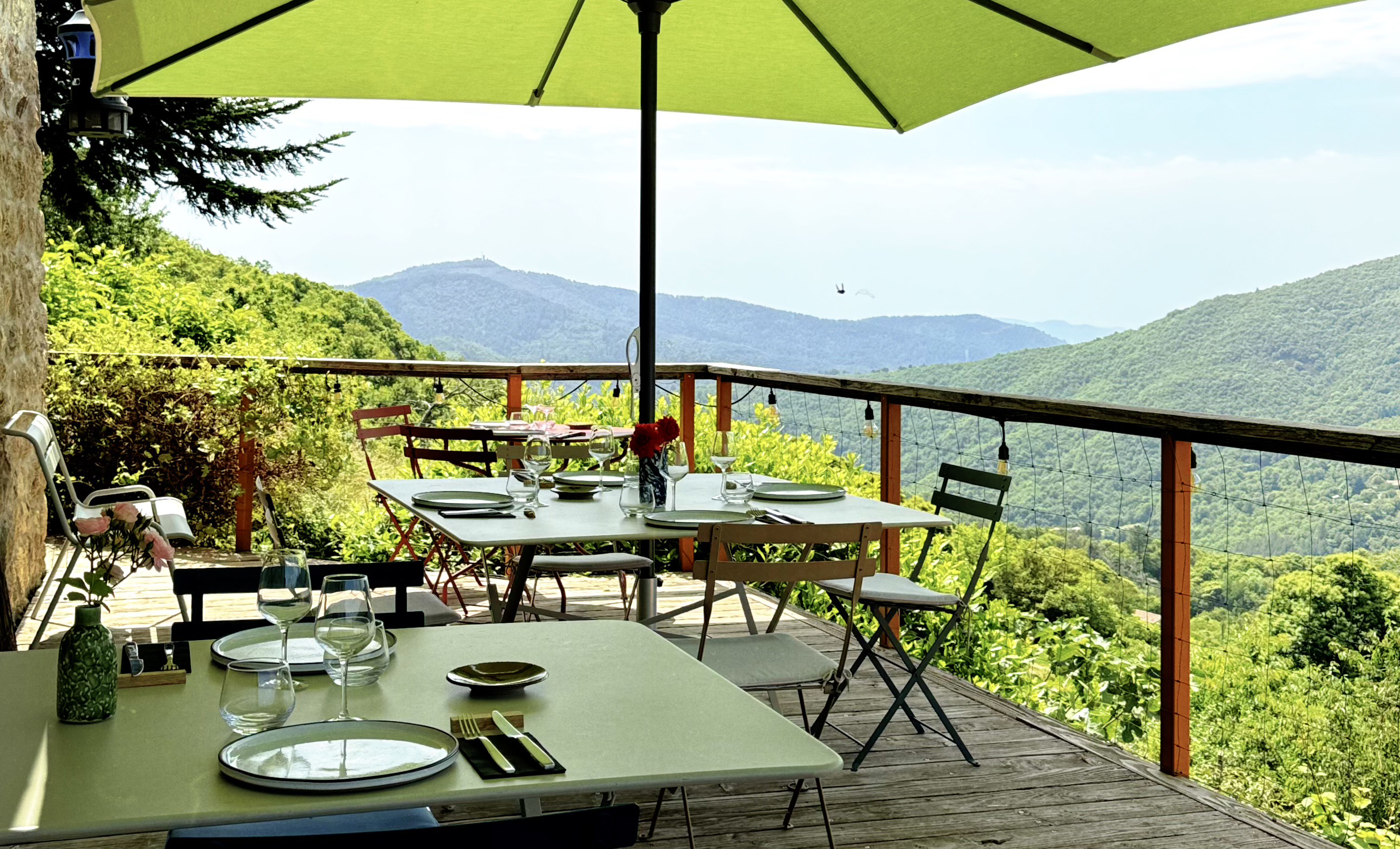 Terrasse panoramique ombragée avec vue magnifique sur les montagnes & salle chaleureuse.