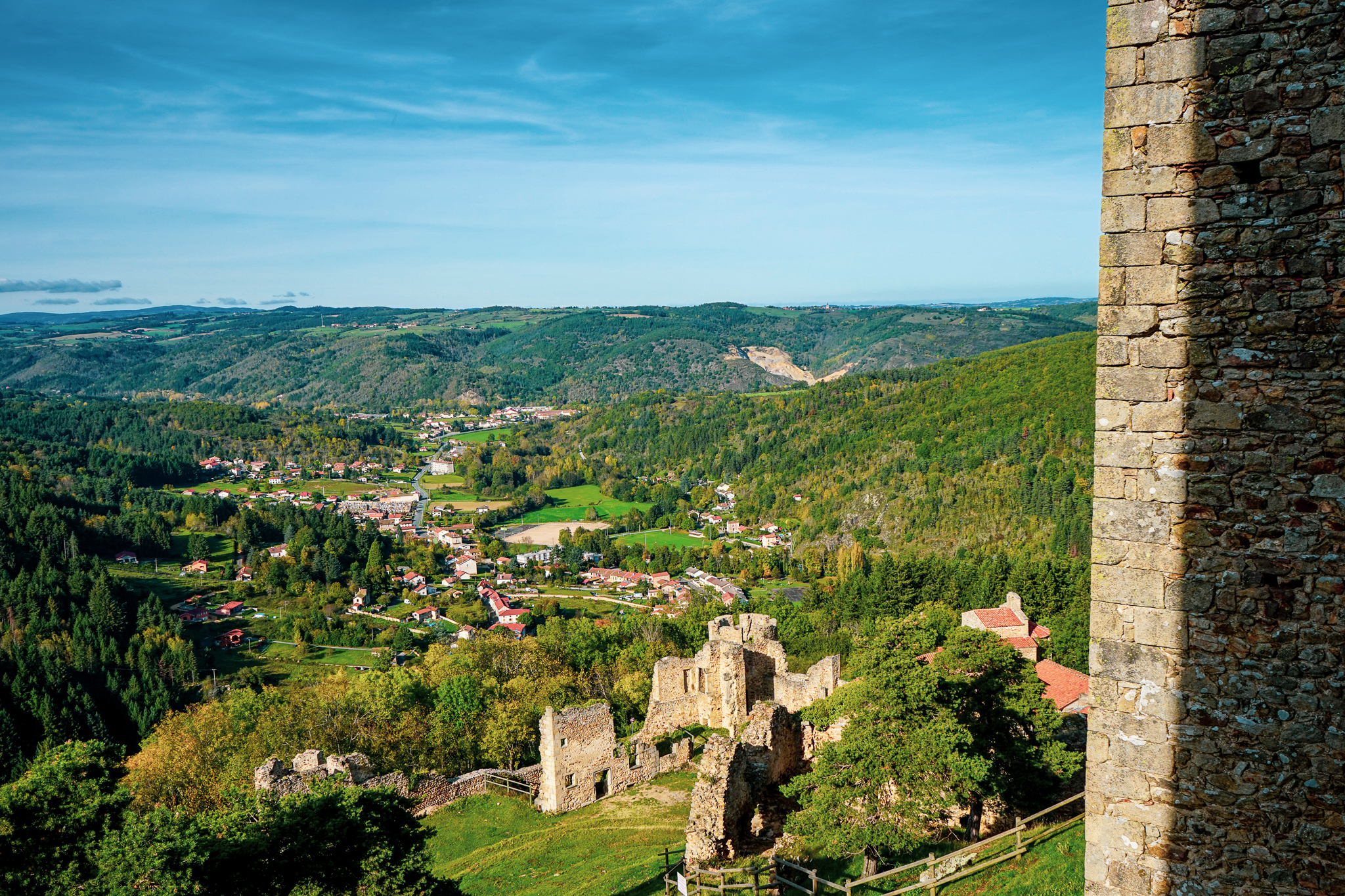 Bâties sur un éperon rocheux en à-pic au-dessus du Lignon, la forteresse médiévale et la chapelle de Couzan offrent un panorama grandiose sur la plaine du Forez, les monts du Lyonnais, du Forez et de l'Auvergne.
