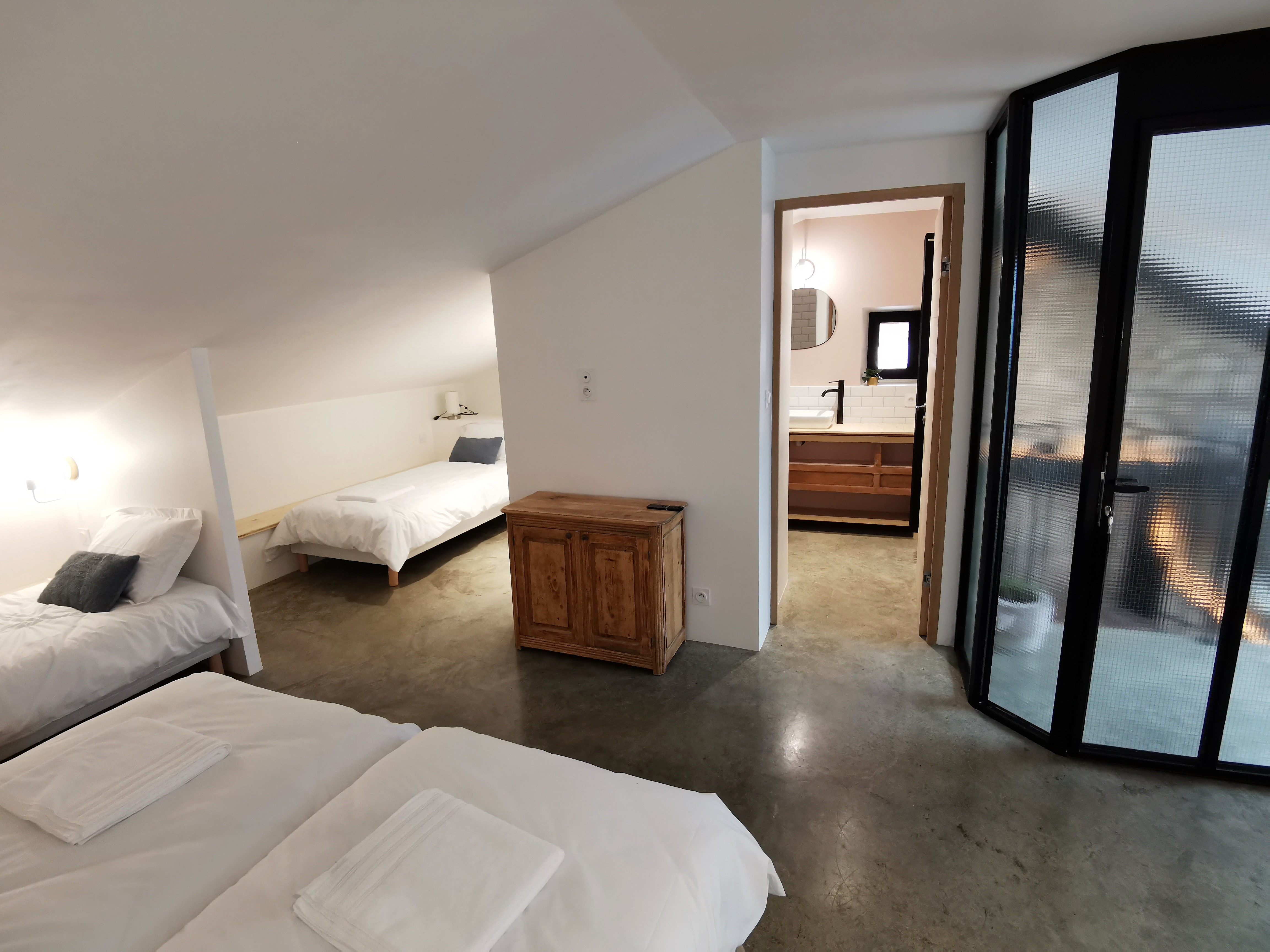 - Chambre 4 pers : 4 lits 1 pers. en 90x190 cm dont 2 lits superposés. Sanitaires privatifs (douche grand format, vasque sur plan et WC).