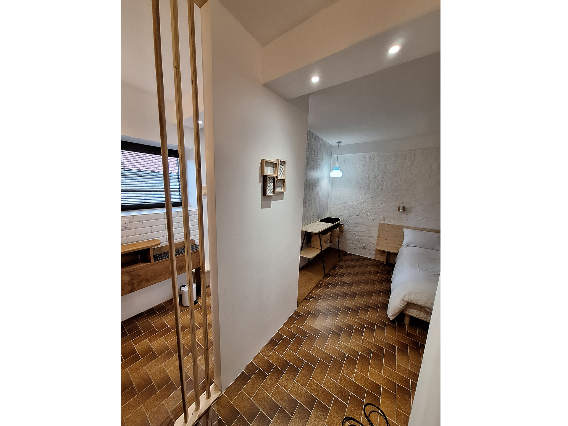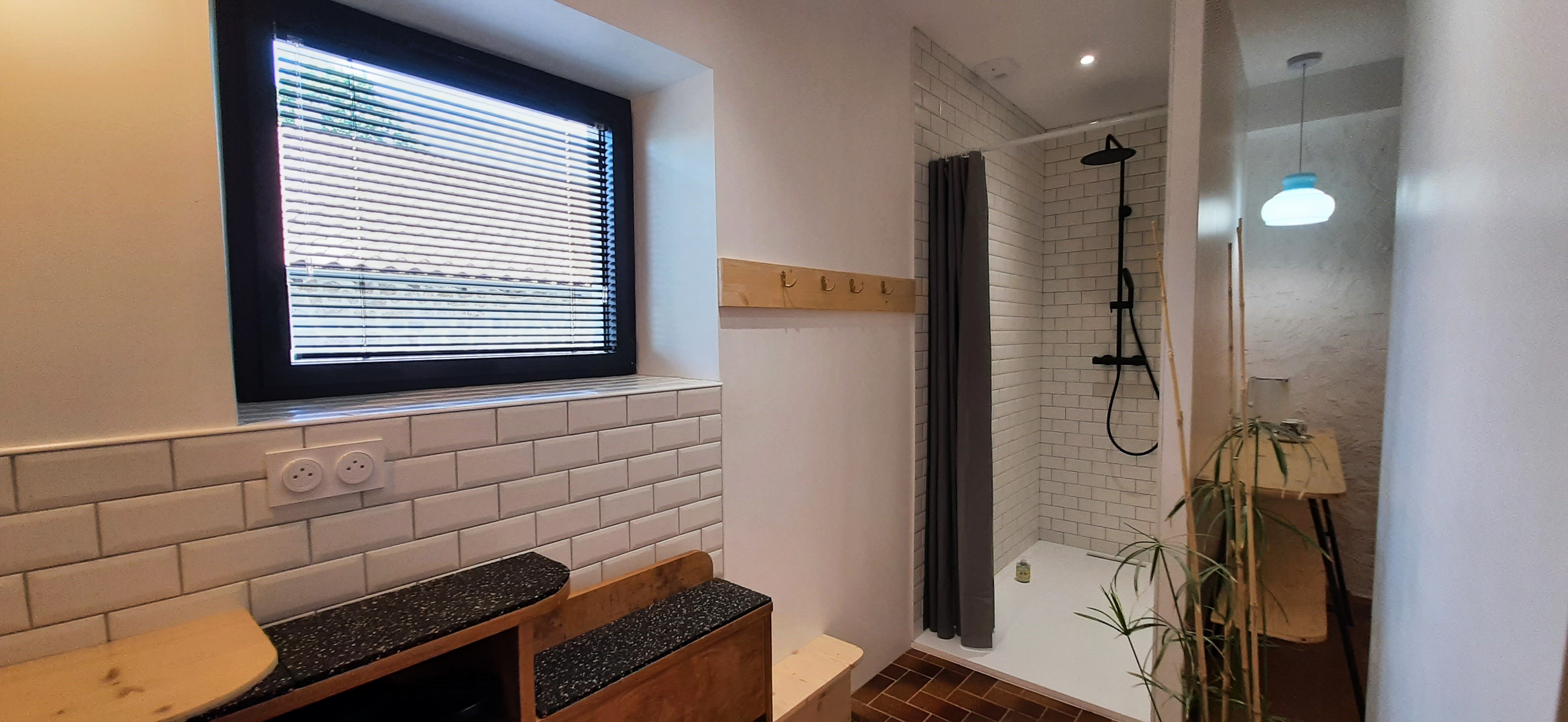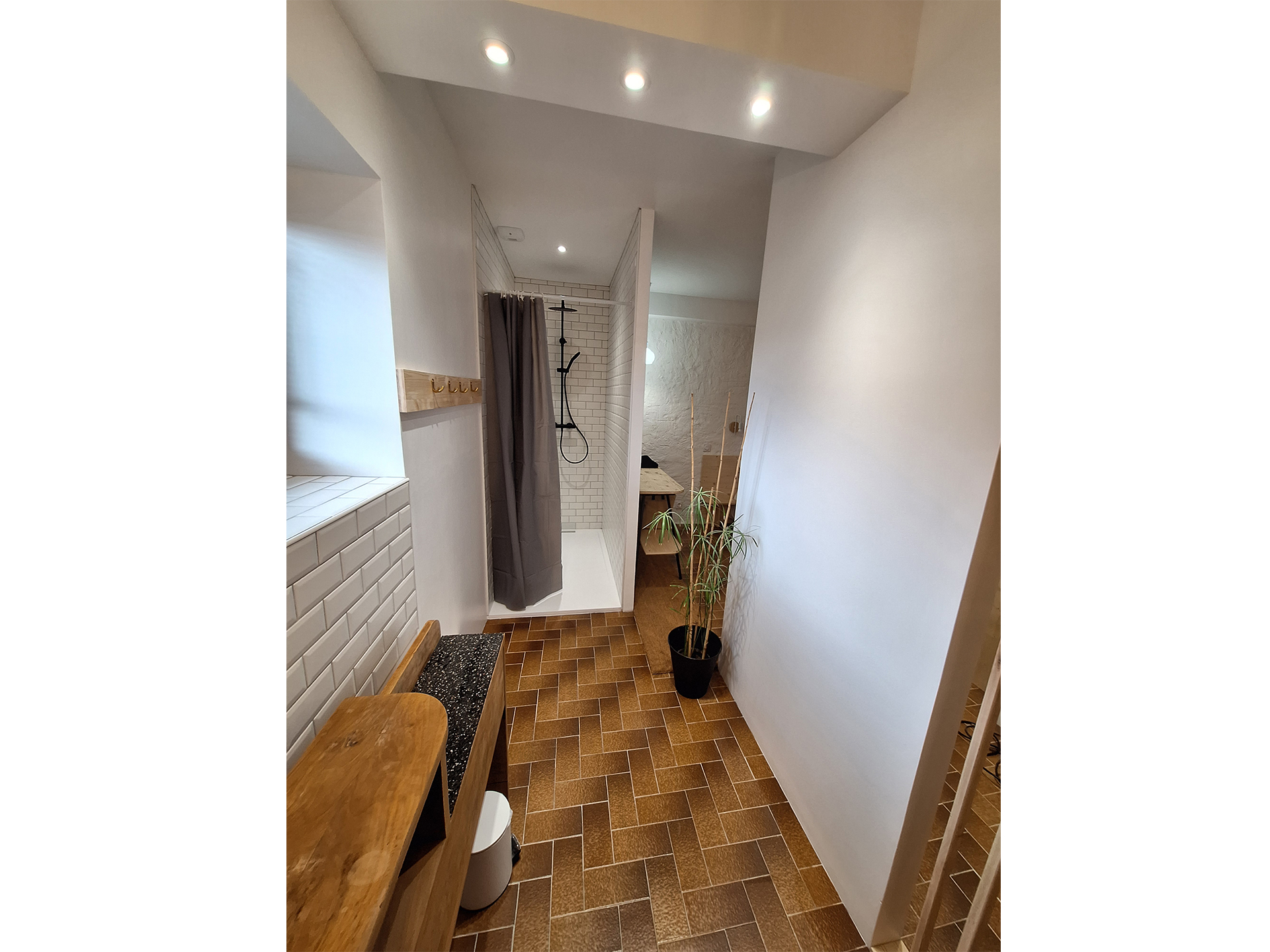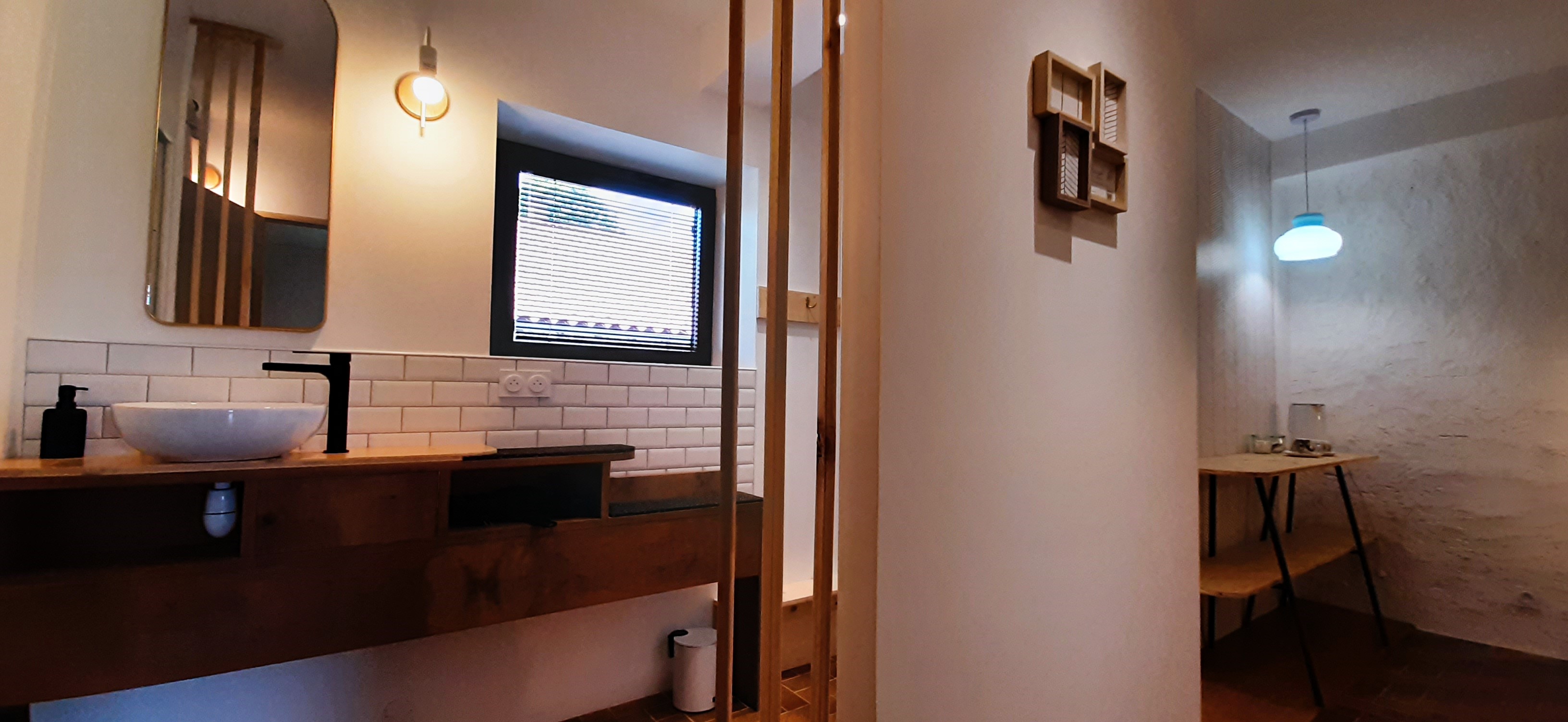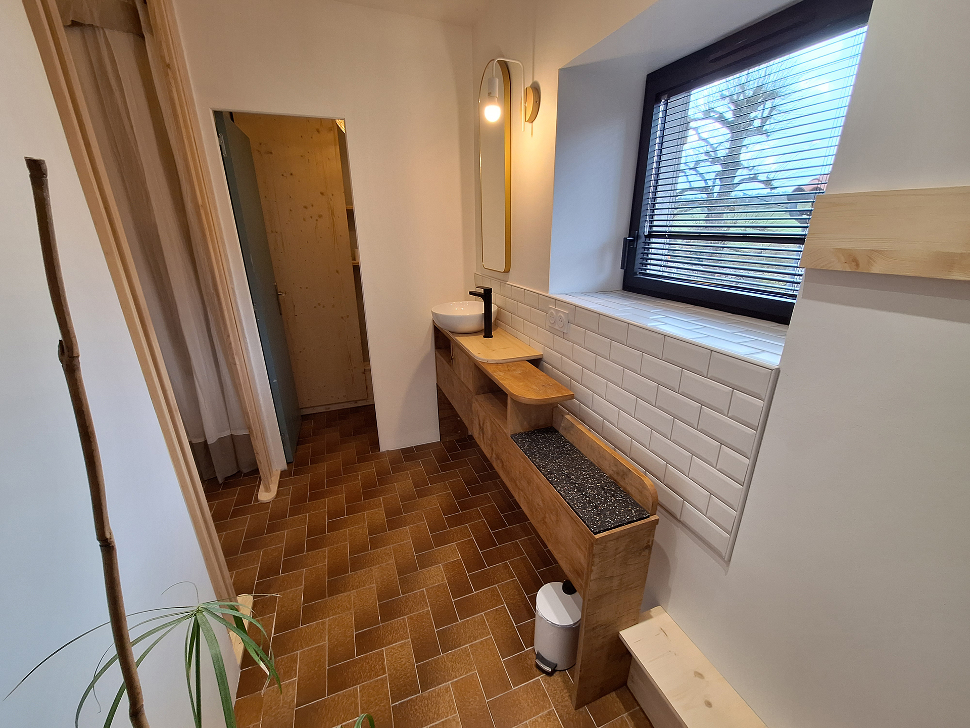 - Chambre 3 pers : 1 lit 2 pers. en 140×190 cm et un lit d’appoint pour un enfant éventuel. Sanitaires privatifs (douche grand format, vasque sur plan et WC).