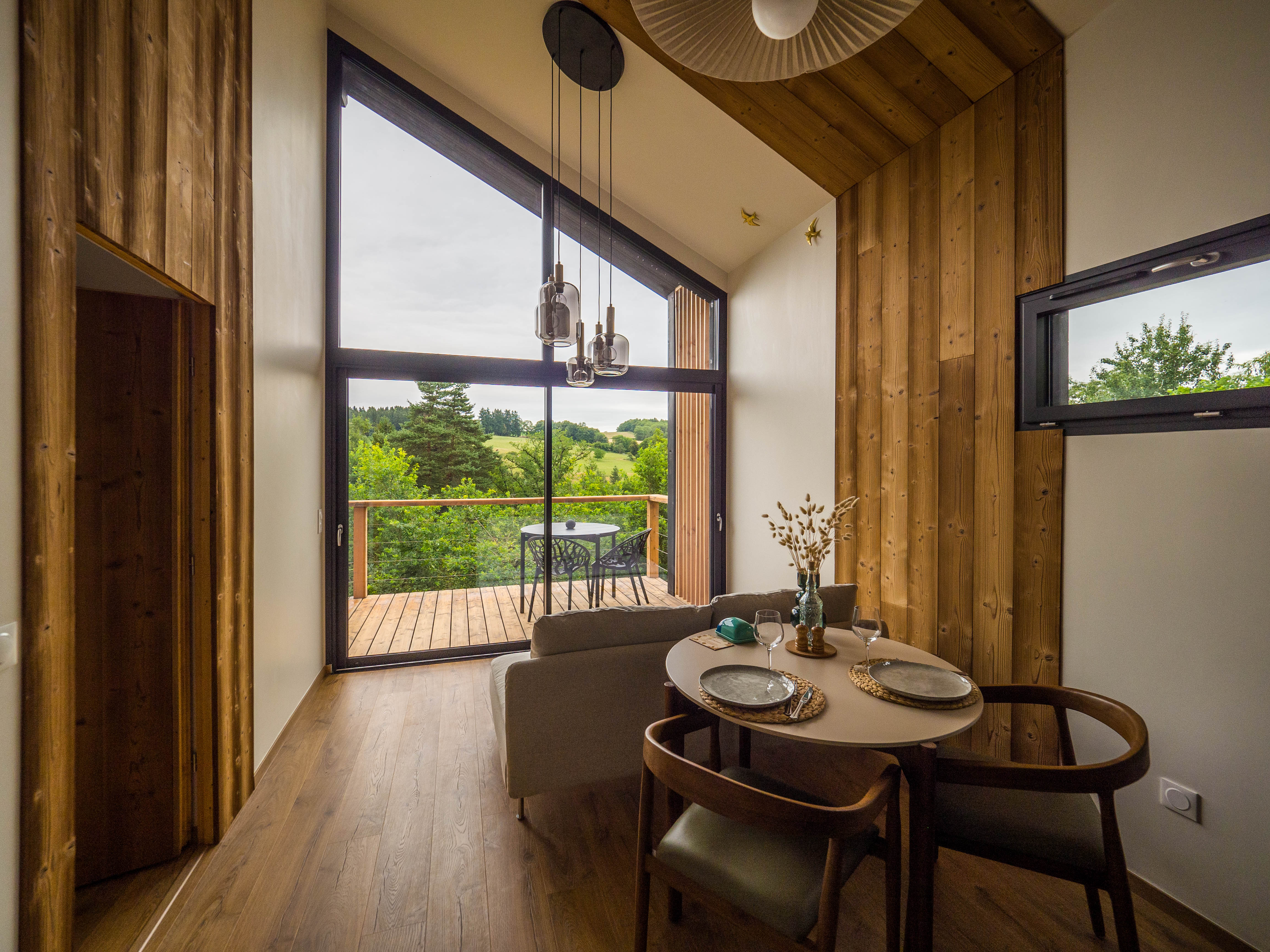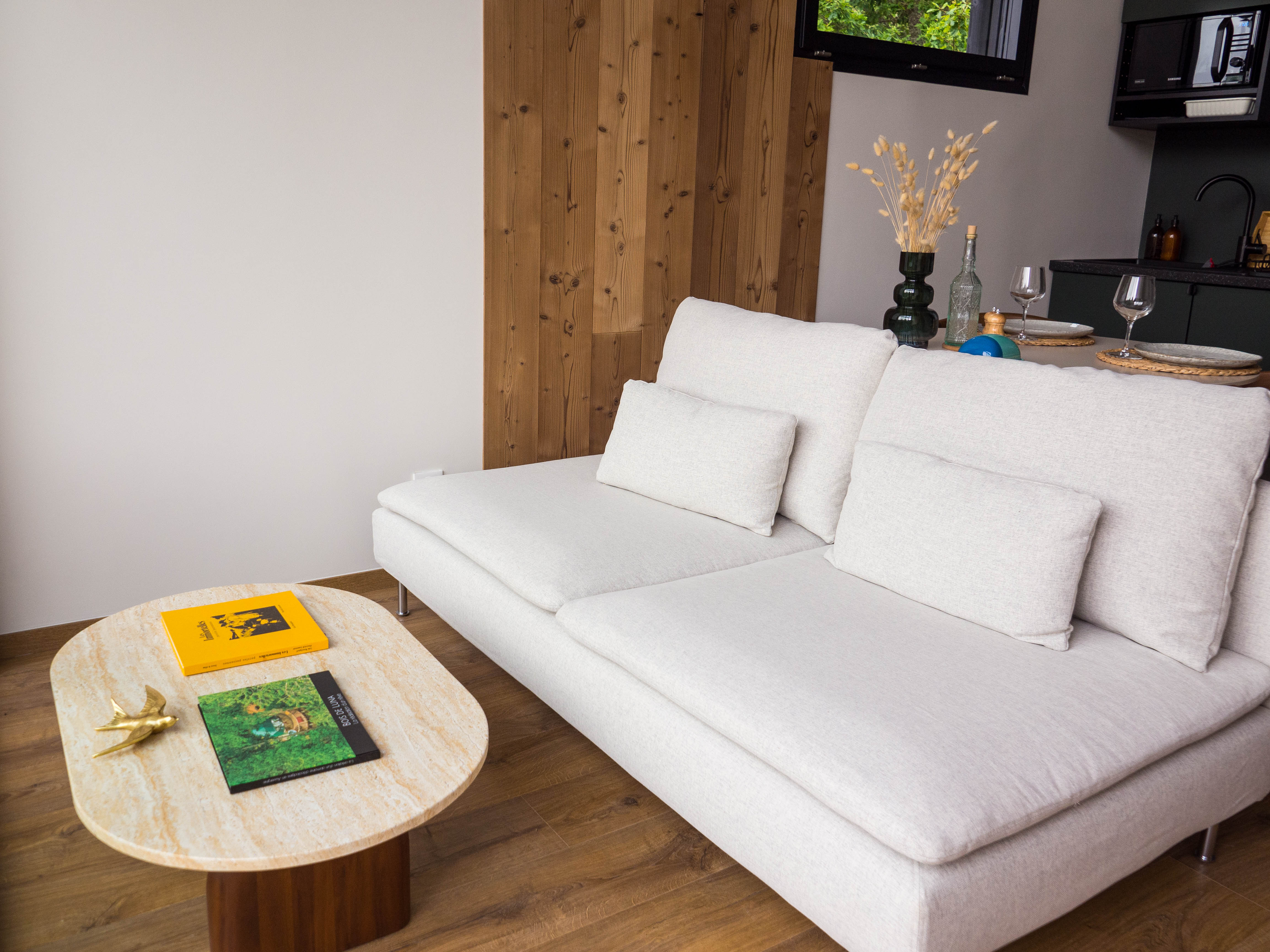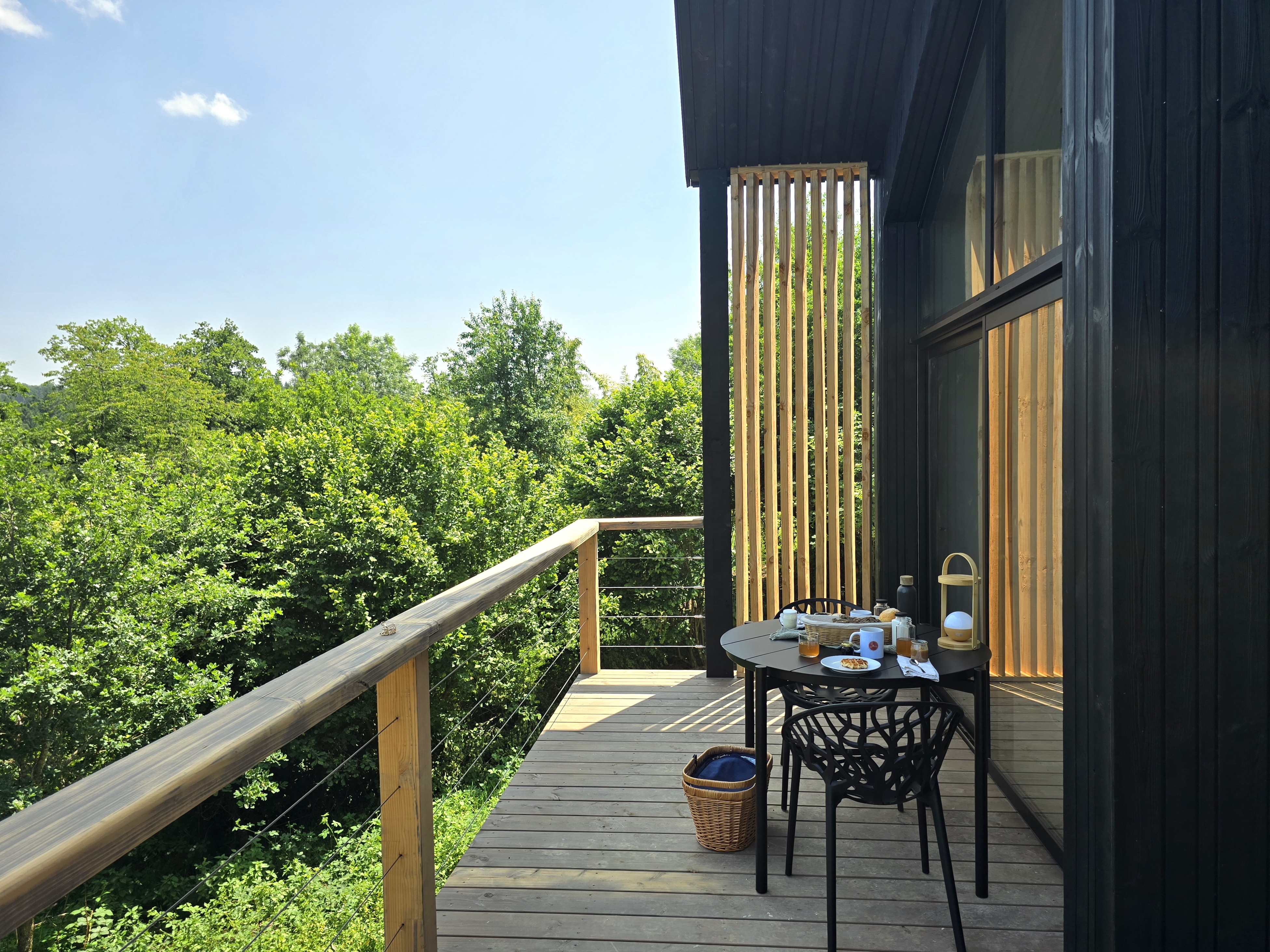 Nichée dans les arbres, la cabane Petite Ourse vous offre une parenthèse intime et design, avec bardage noir, baies vitrées, terrasse perchée et jacuzzi massant. Vivez une nuit en pleine nature, sans compromis sur le confort et la qualité.