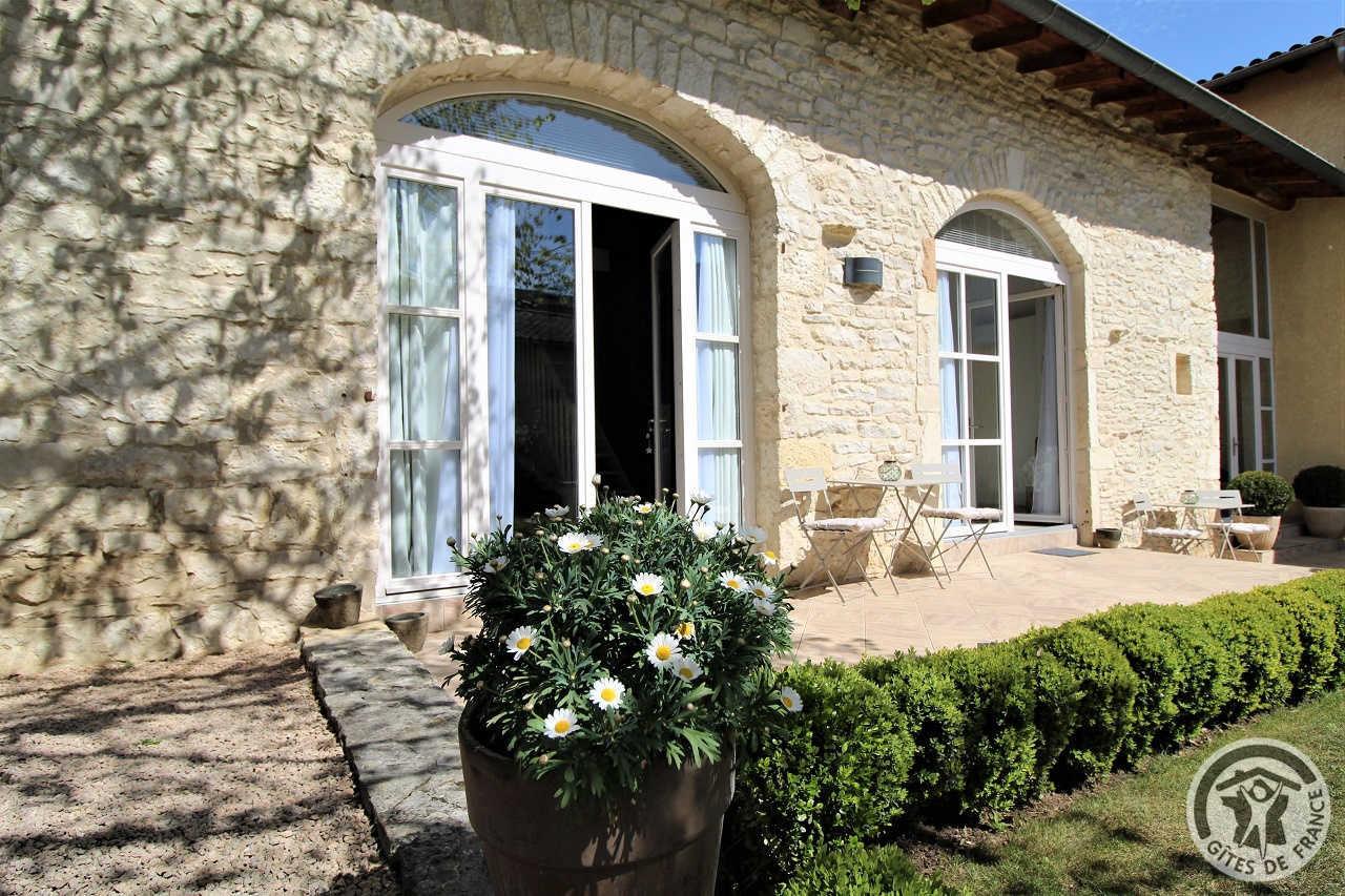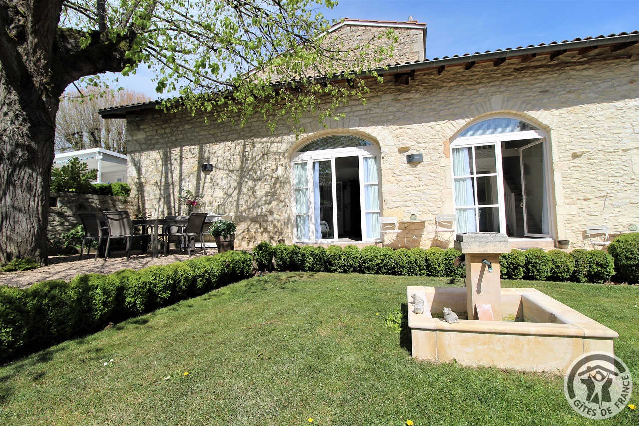 Derrière le portail se niche la propriété construite de pierres blanches (une particularité du village), avec un jardin intérieur arboré et fleuri et une piscine chauffée avec pool house.