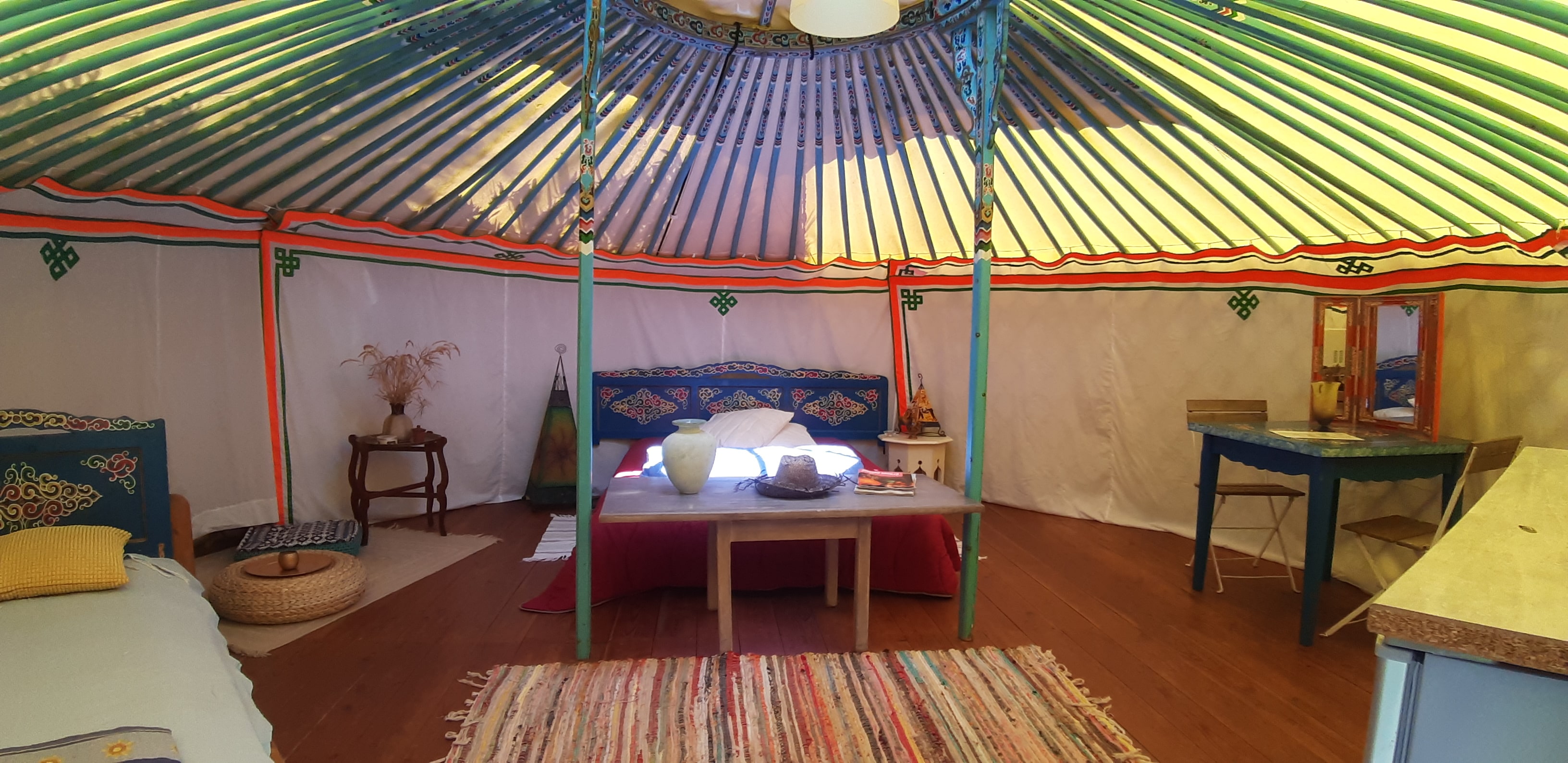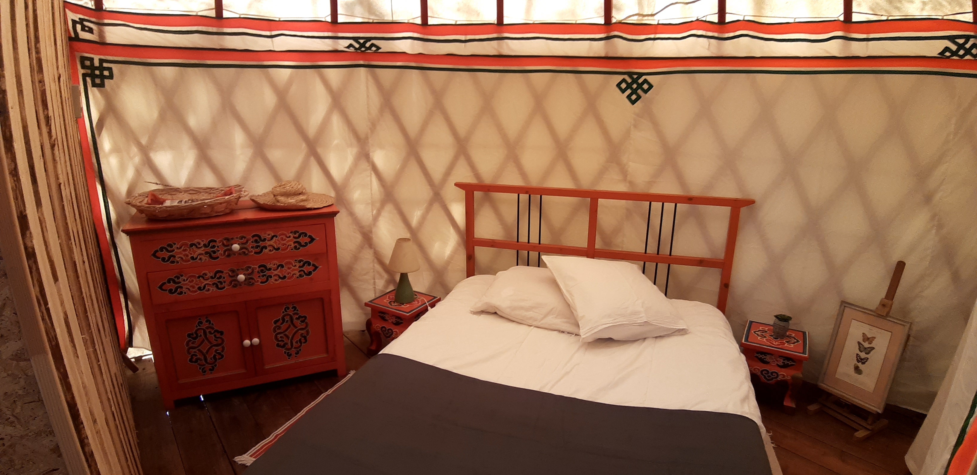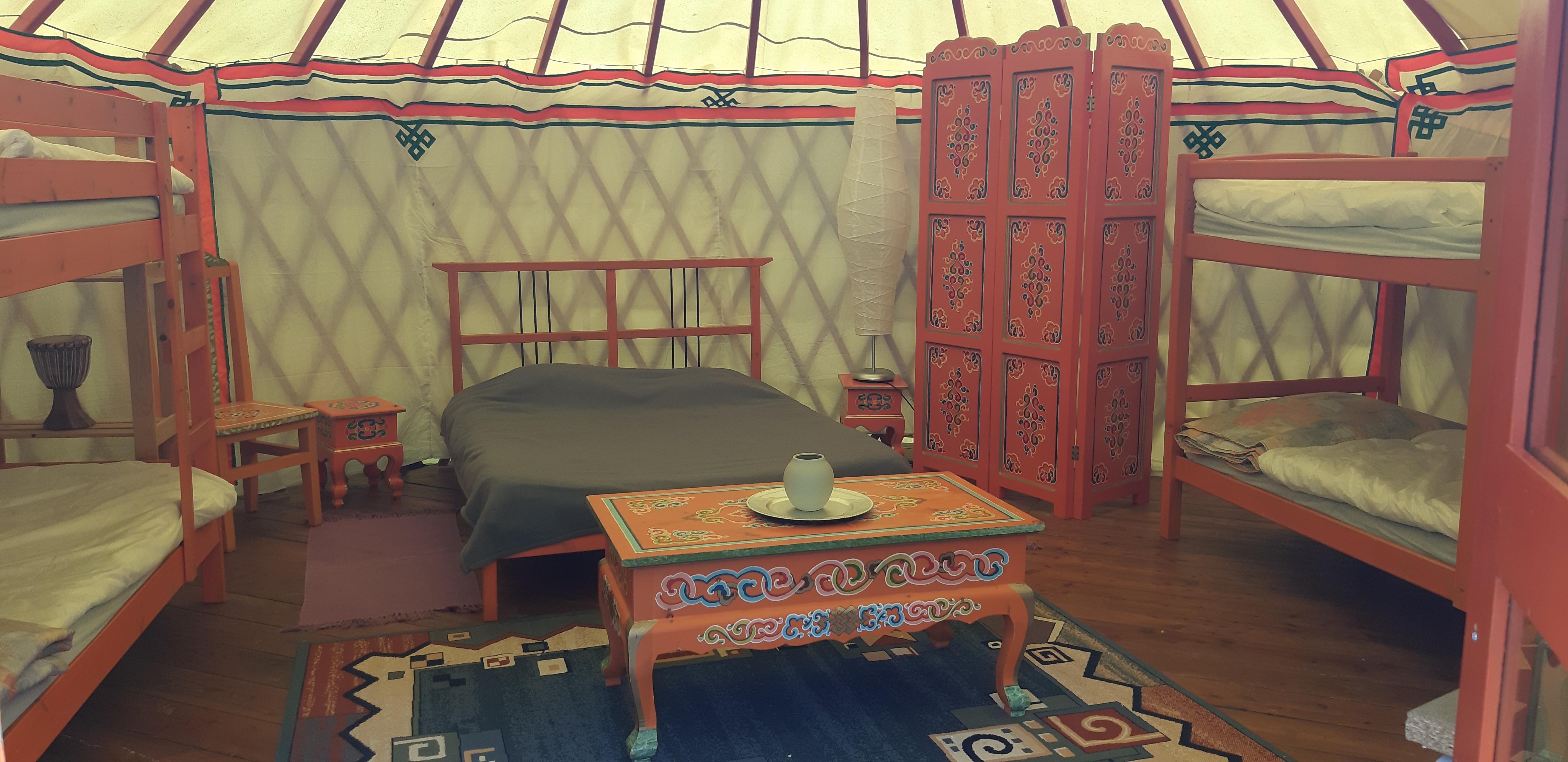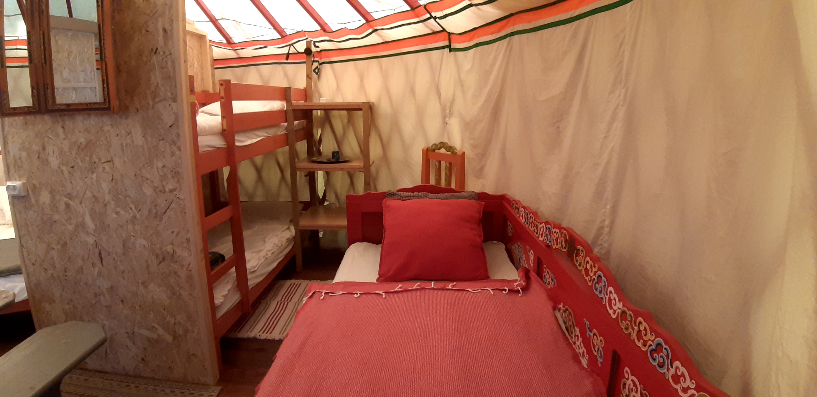 Que vous soyez en amoureux, en famille ou entre amis, venez vous évader dans l'une de nos 7 yourtes, vastes tentes rondes et conviviales, où toute la tribu se retrouve dans une pièce unique et chaleureuse. L'ossature des yourtes est faite de perches peintes à la main par les femmes mongoles et d'une toile imperméable, certaines avec un feutre en laine bien isolant. Les deux yourtes pour 5 personnes bénéficient désormais de 2 chambres et l'une d'elle d'une salle de bain !