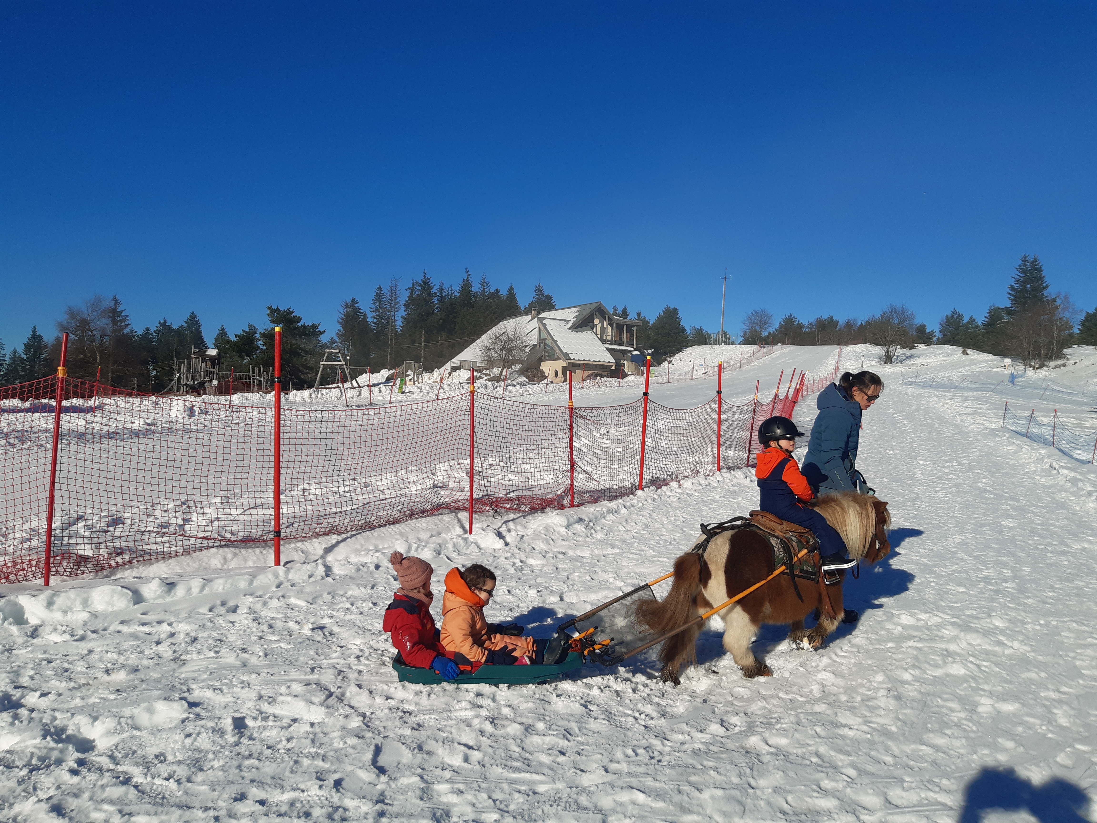 Trop petit pour faire du ski joering ? On a trouvé la solution : faites découvrir à vos enfants à partir de 2 ans la luge joering, une luge tractée par un poney !