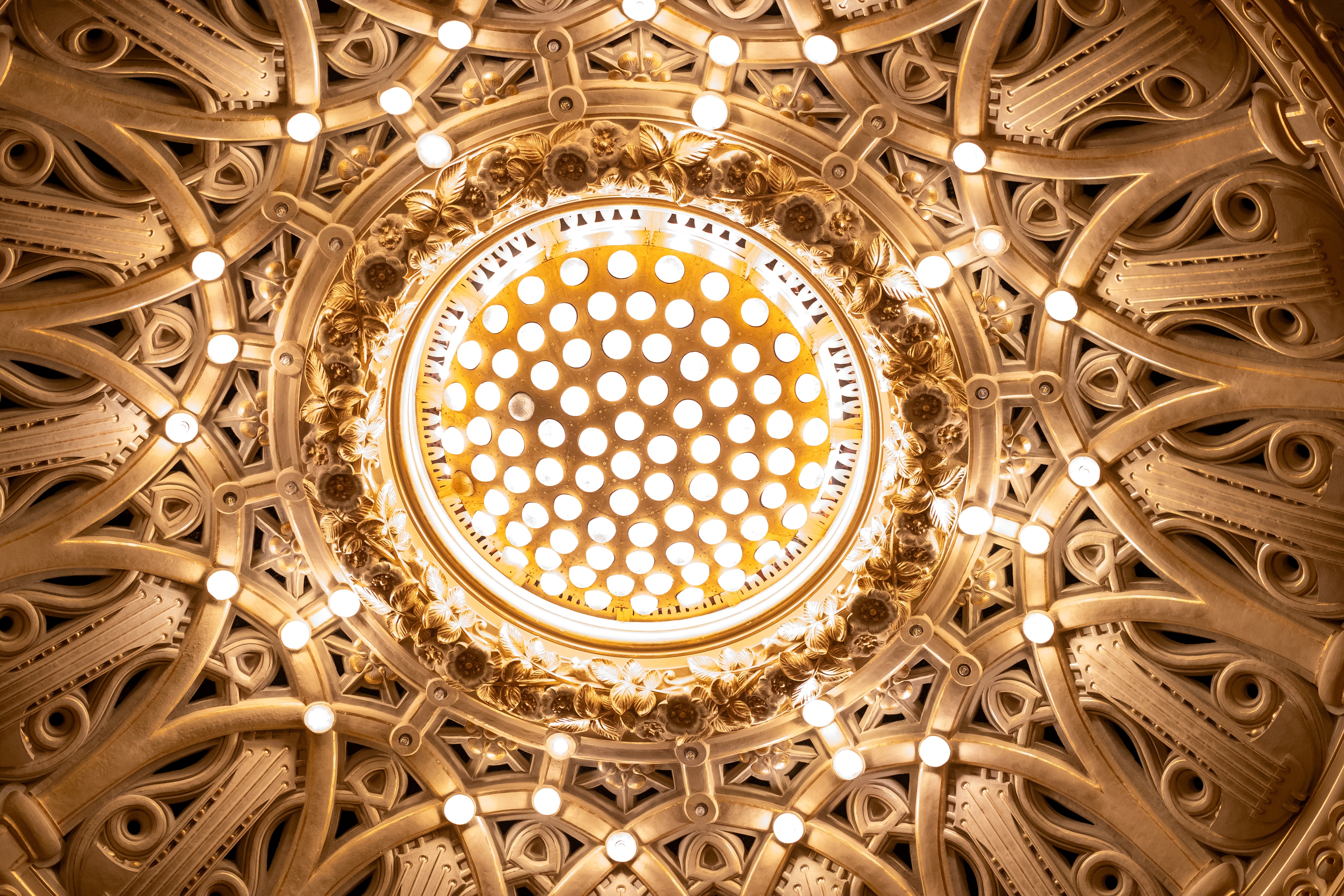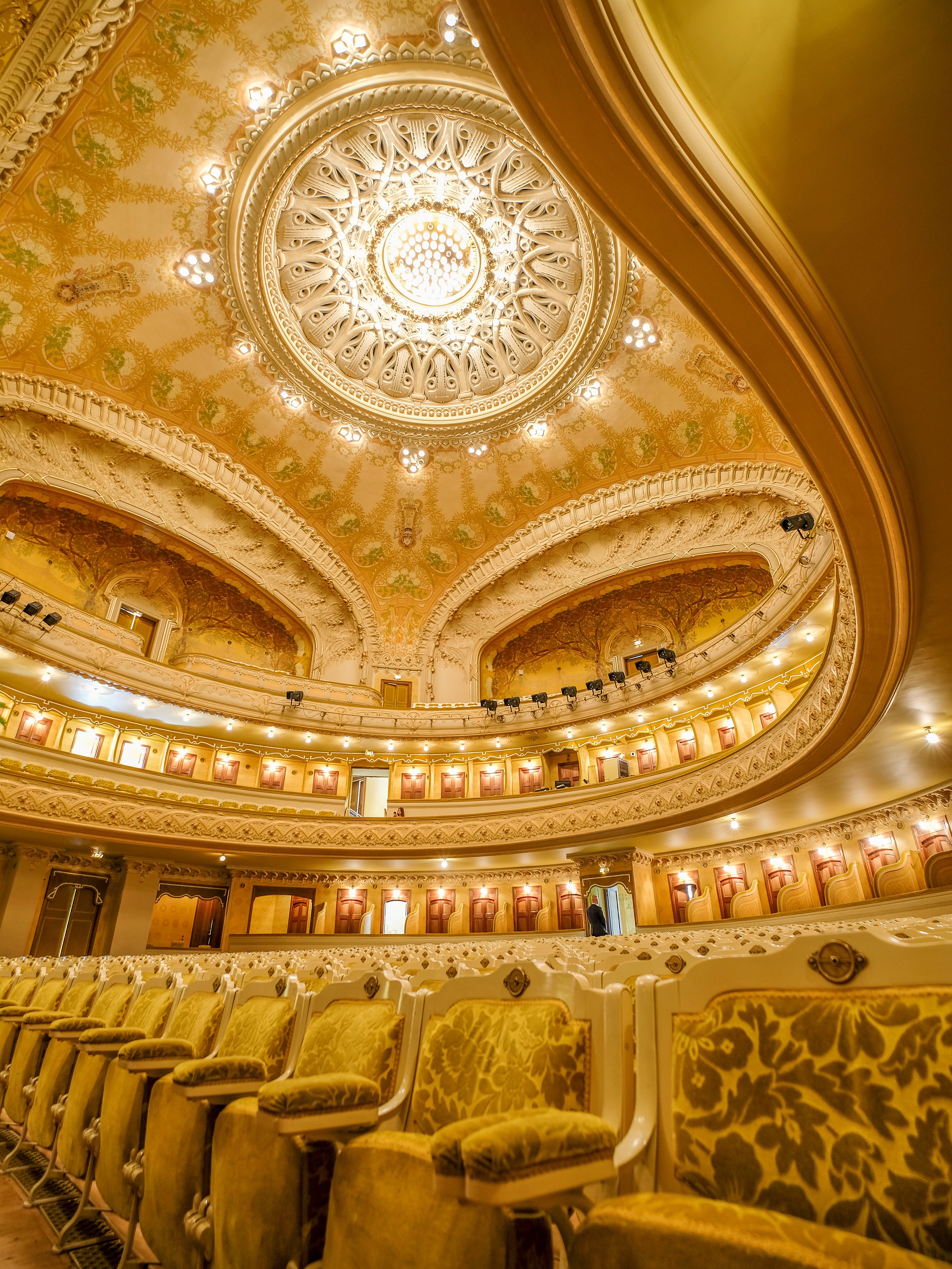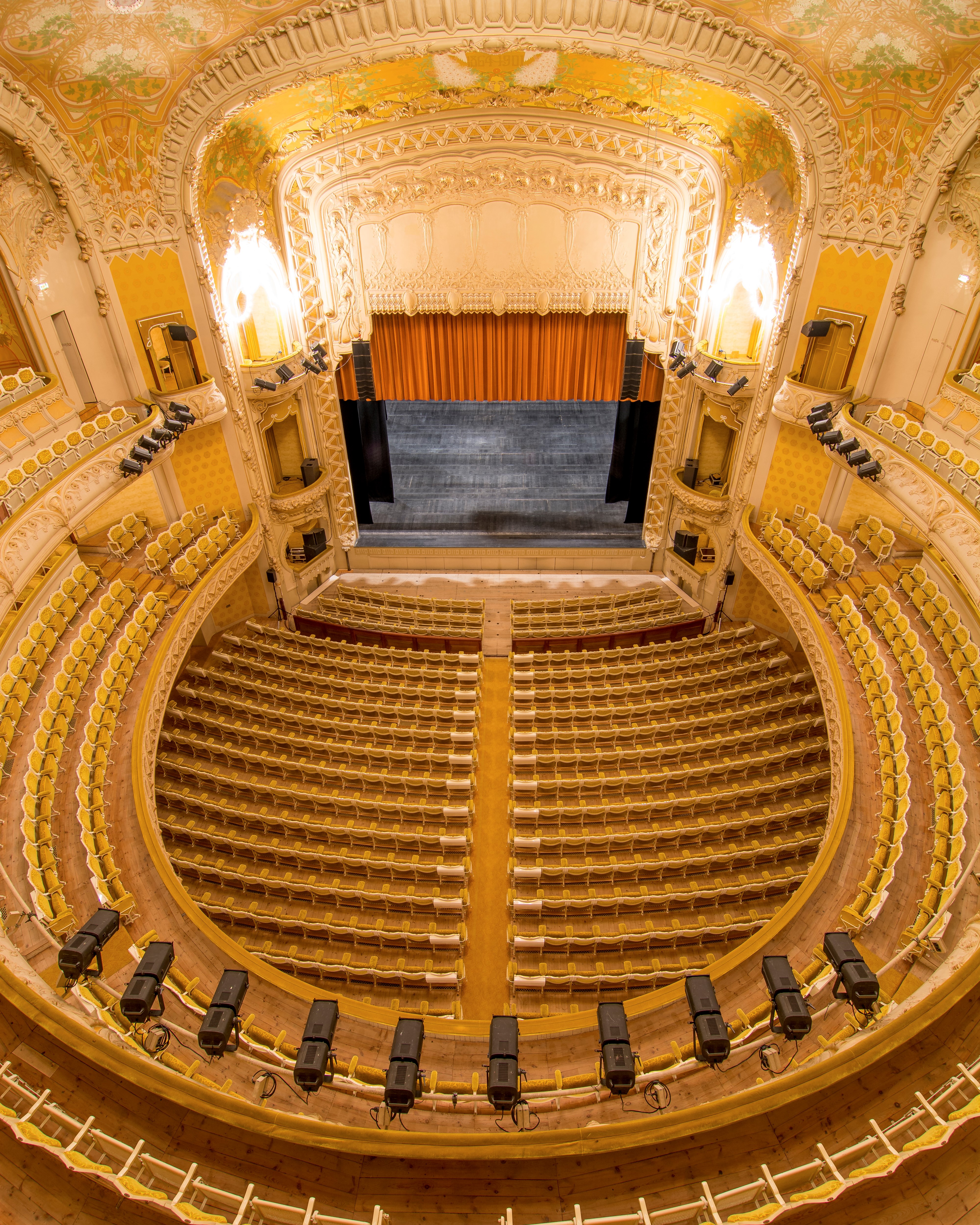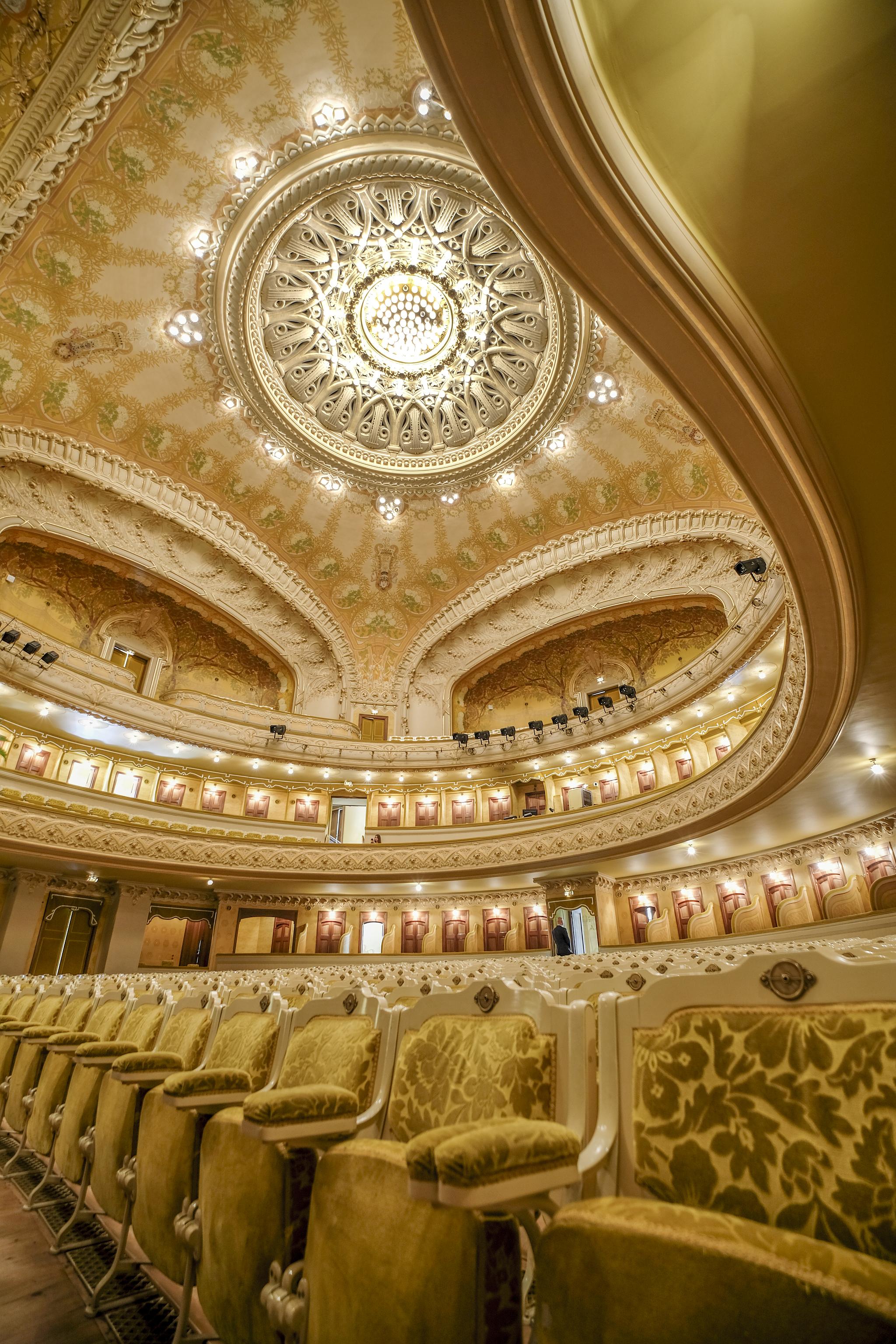 Sa structure métallique sans piliers et sa décoration de style Art nouveau, mêlant motifs végétaux et attributs du théâtre et de la musique dans les tons or et ivoire, en font une salle exceptionnelle. Cette décoration est l’œuvre d’une équipe de jeunes artistes : Léon Rudnicki pour la peinture, Pierre Seguin pour le staff et Émile Robert pour la ferronnerie.