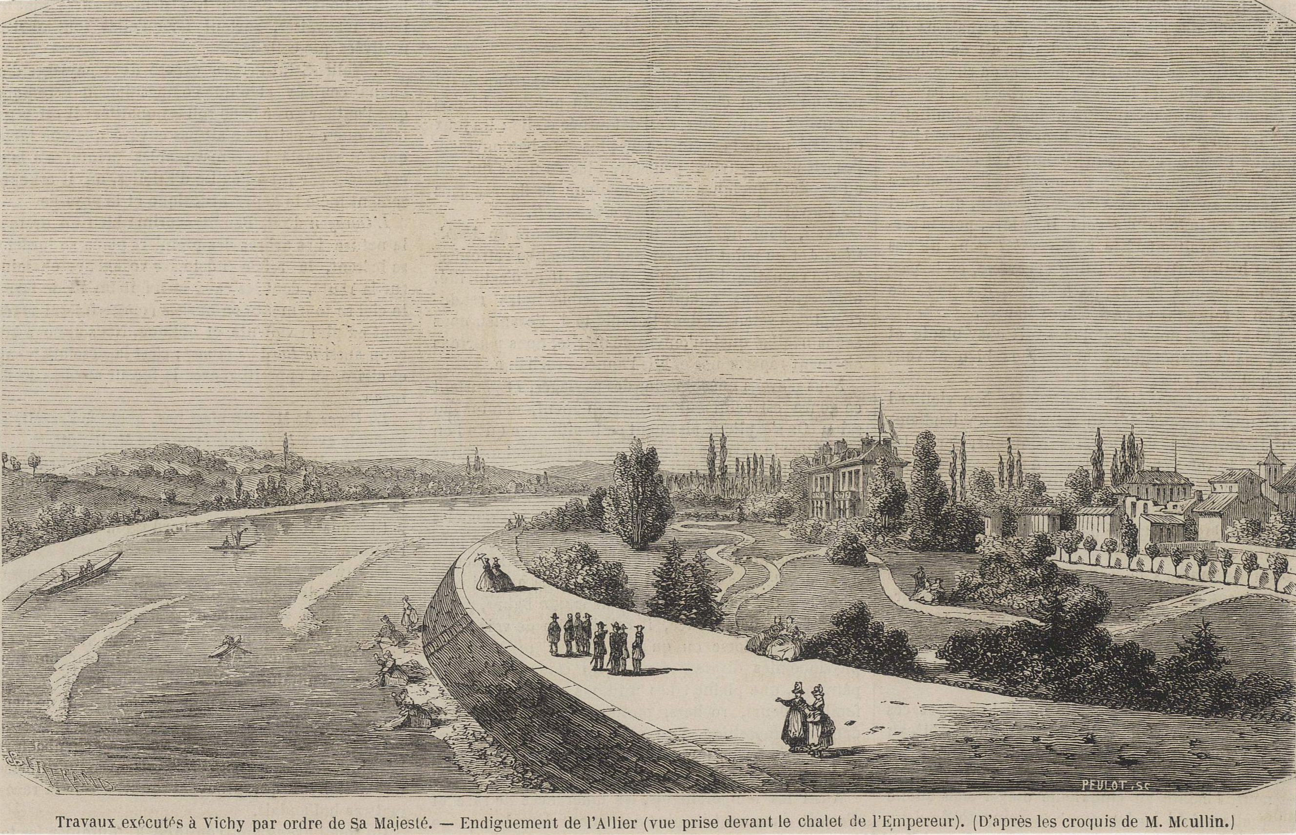 Plusieurs projets sont alors élaborés, visant à l’extension du parc des Sources jusqu’à la rivière ; mais la spéculation foncière empêche cette réalisation. En 1861, un décret impérial impose l’aménagement du parc Napoléon III sur l’emplacement d’un bras secondaire de l’Allier, asséché grâce à la construction d’une digue. Les travaux sont dirigés par l’ingénieur Jean-François Radoult de La Fosse, et la conception paysagère confiée à l’horticulteur moulinois Joseph Marie.