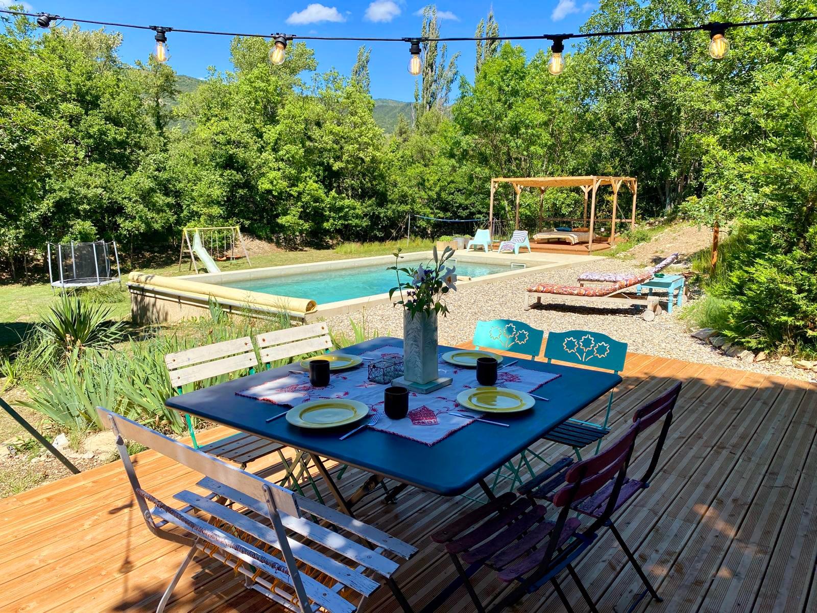 Le gîte est situé au cœur du Parc Naturel Régional des Baronnies Provençales, entre les lavandes, les tilleuls et l'Ouvèze. Cette rivière (Rio en espagnol) est accessible de manière privative et borde le terrain d'un hectare qui offre de nombreux espaces (plage de rivière, coin lecture, prairie, terrain de jeux) où s'intègre aussi une magnifique piscine (10x5m).