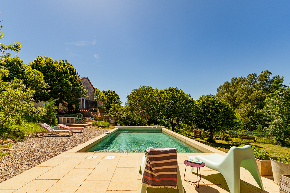 - Piscine (10x5m), non chauffée, équipée d'une bâche à bulles et d'une alarme, prolongée par zone détente avec pergola et ombrière.