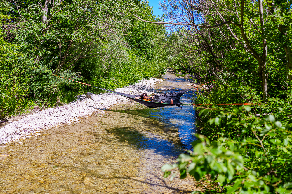 - Partie libre (accès via 3 portillons) qui comporte une prairie avec terrain de football, des petits chemins en bord de rivière et des petites plages de rivière (hamac au-dessus de l’eau).