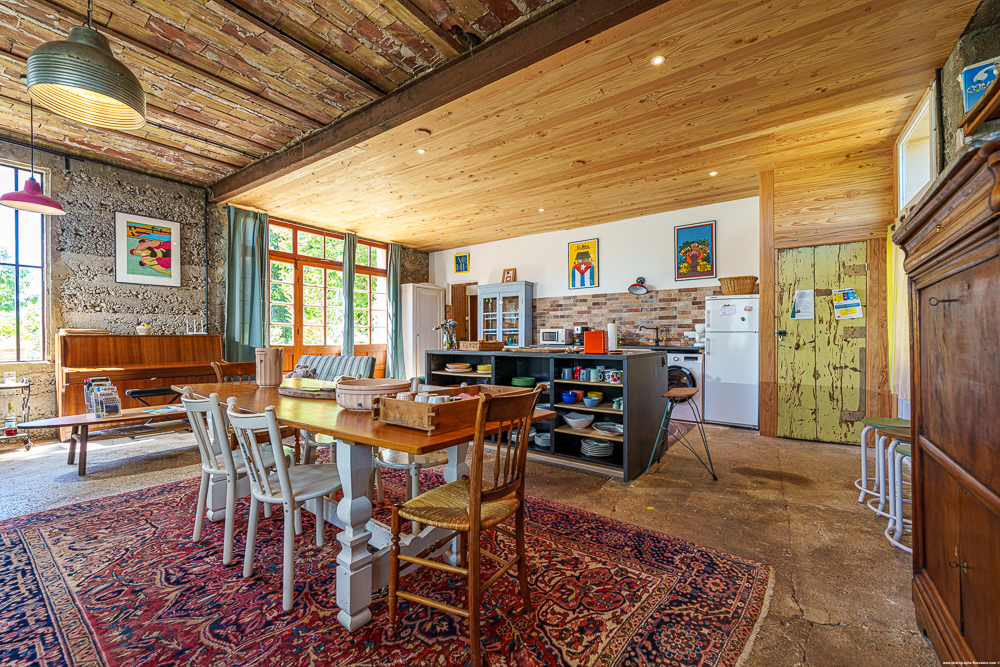 Rez-de-chaussée : Grande pièce ouverte avec cuisine équipée, séjour et salle à manger.