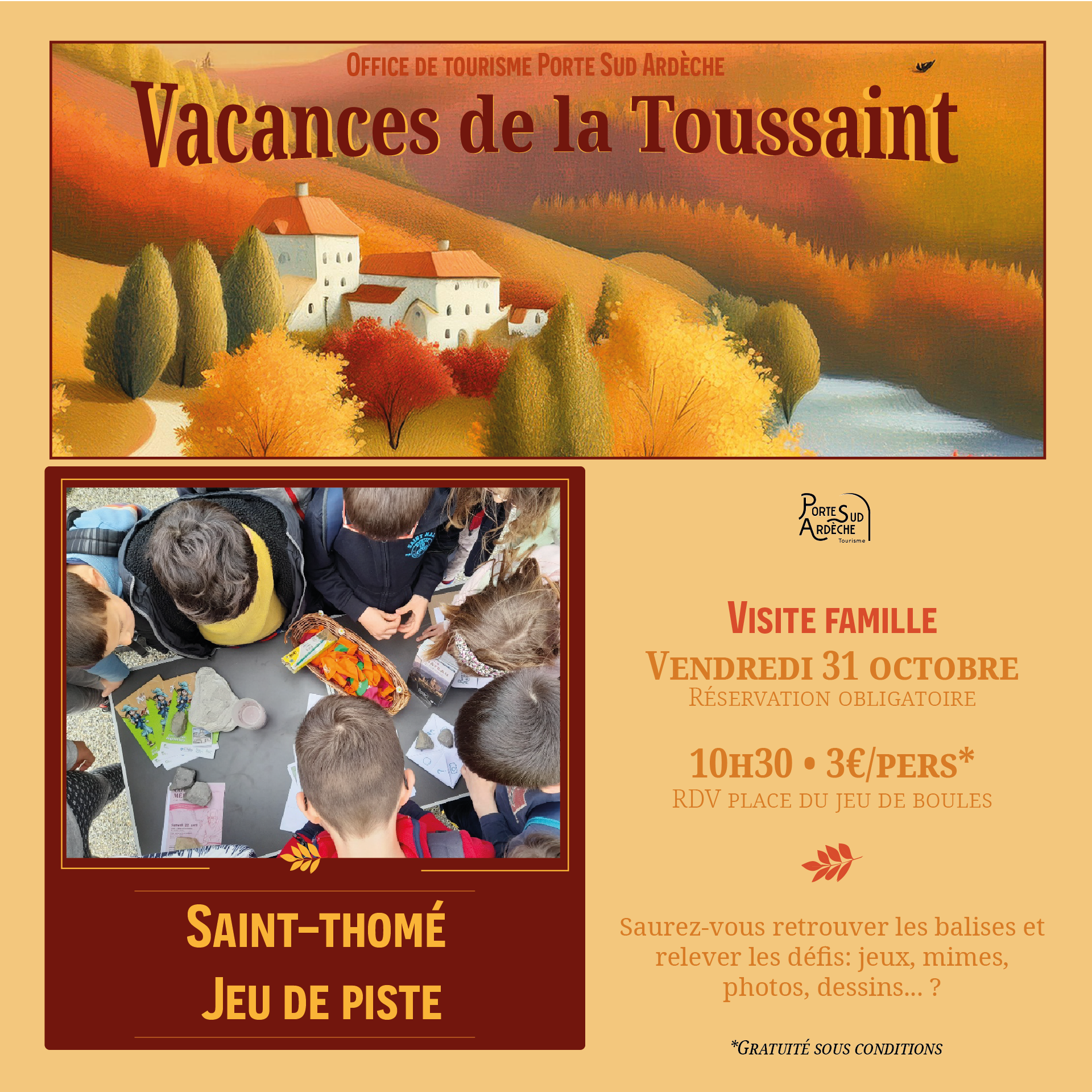 Saurez-vous retrouver les balises et relever les défis de la cocotte ? Petits et grands vont devoir coopérer afin de mener à bien les missions. Rendez-vous place du jeu de Boules pour récupérer vos défis puis parcourez le village de Saint-Thomé.