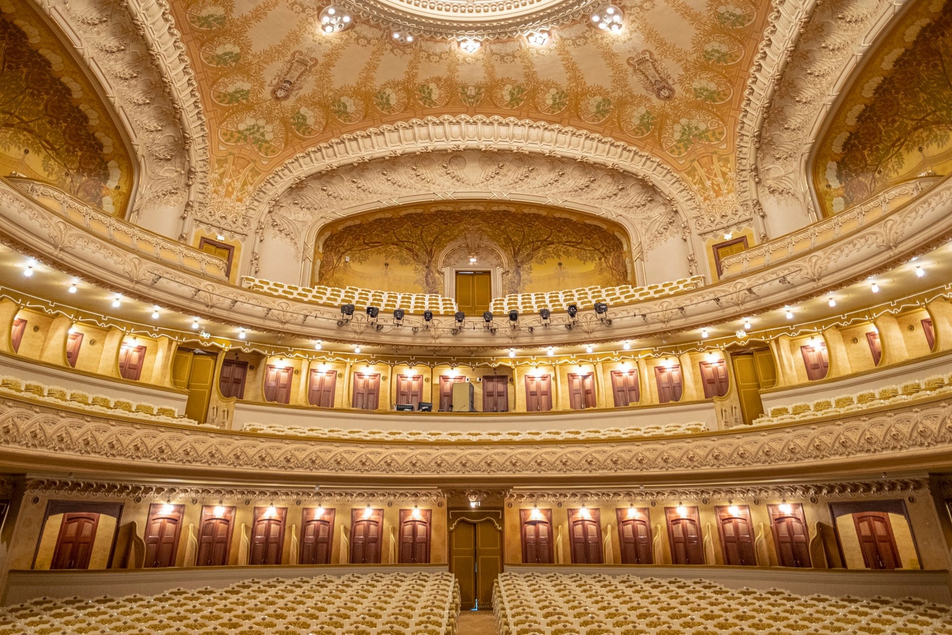 Chrysanthèmes, marguerites, roses, volubilis s’épanouissent dans une harmonie d’or et d’ivoire, paons, visages (Sarah Bernhardt, Réjane, Coquelin, Mounet-Sullly), lyres (Léon Rudnicki), papiers peints (Ruber), sculptures (Pierre Seguin), ferronneries (Emile Robert), forment un ensemble élégant, harmonieux, simple et sophistiqué à la fois, marqué par le goût de l’époque.