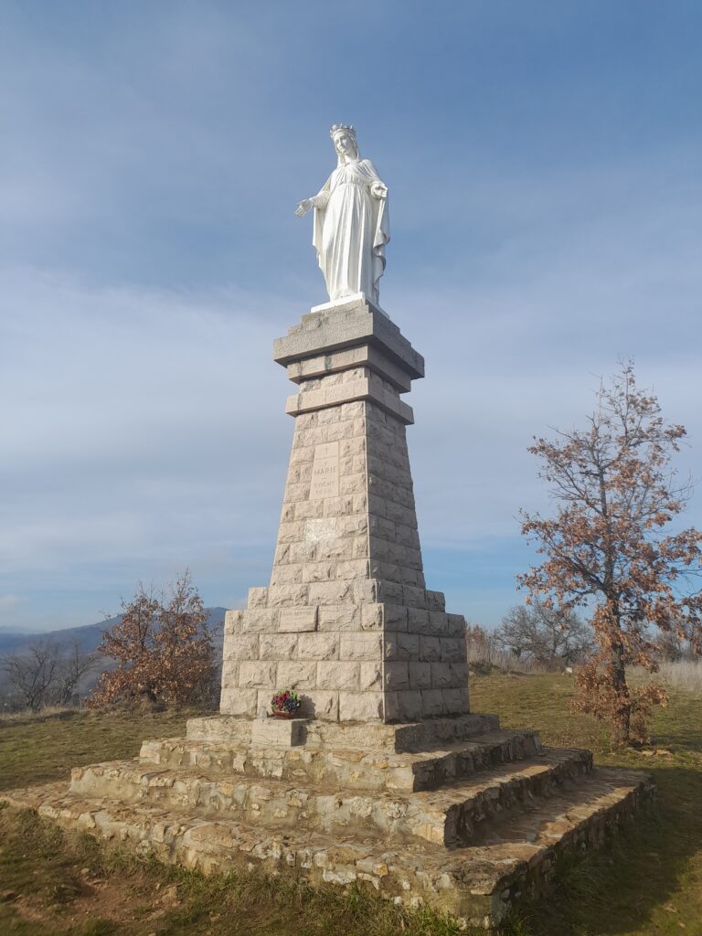 La madone veille paisiblement sur le village, avec à proximité une cadole posée au milieu du paysage et les vignes du Beaujolais s’étendent à perte de vue.
